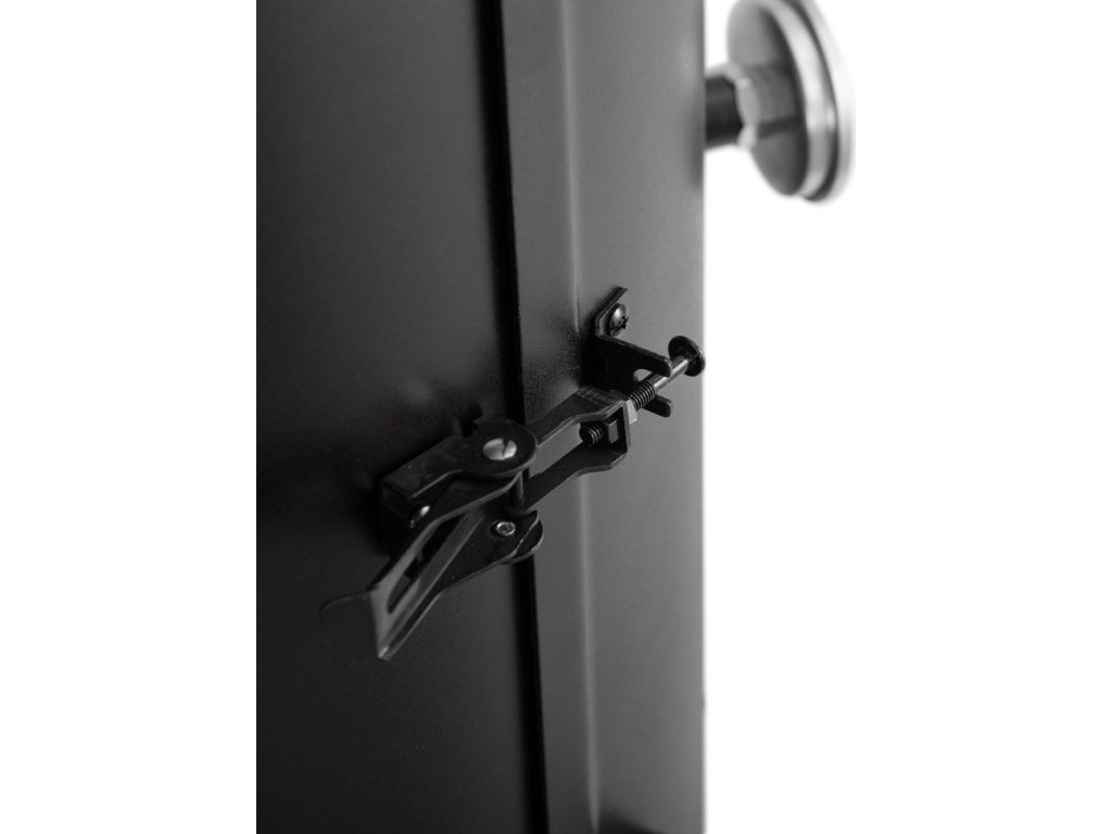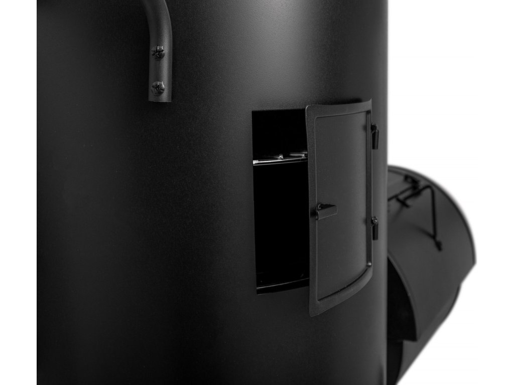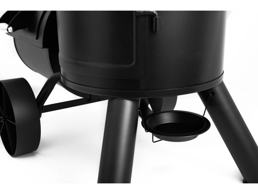Na zadní straně udírny jsou malá dvířka, kterými můžete pohodlně doplňovat vodu v misce na vodu bez toho, že by došlo k prudkému snížení teploty v udírně otevřením velkých hlavních dvířek. Pod udírnou najdete ještě praktickou misku na odkapávající tuk.