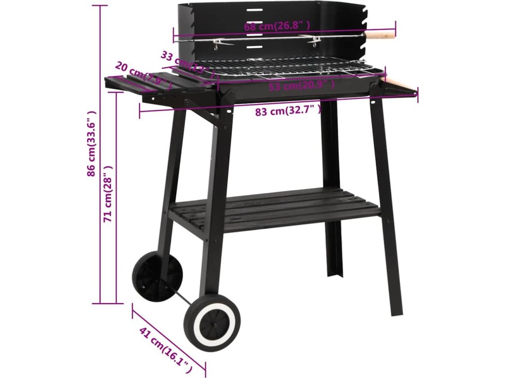 - Nastavitelná výška: Výšku stojanu grilu lze snadno nastavit v rozmezí 71 až 85 cm, aby se co nejlépe využil žár dřevěného uhlí.