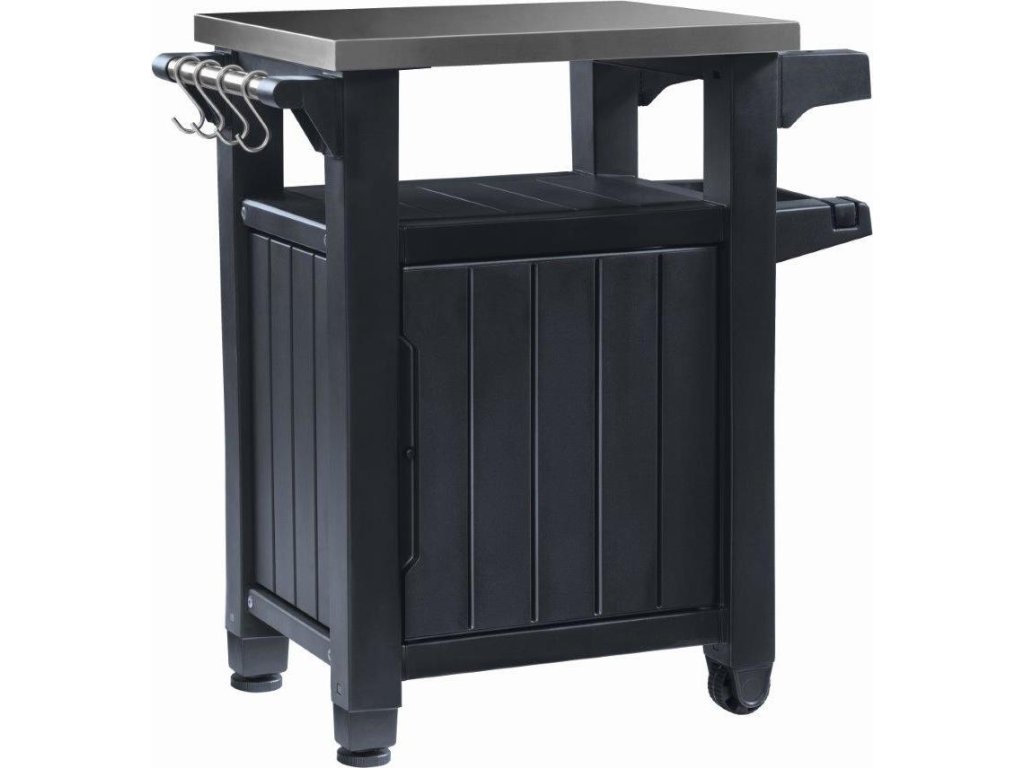Grafitový grilovací stolek Unity značky Keter má kapacitu 105 litrů. Nerezová pracovní deska, praktická rukojeť s háčky na pověšení utěrek a kolečka pro přemisťování stolku dohromady vytvářejí dokonalé prostředí pro venkovní grilování.