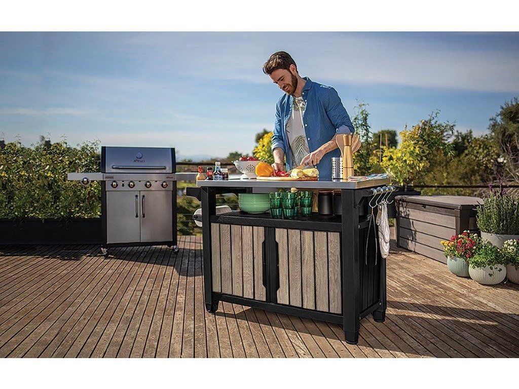 Grilovací stolek Unity XL značky Keter má kapacitu 207 litrů. Nerezová pracovní deska, praktická rukojeť s háčky na pověšení utěrek a kolečka pro přemisťování stolku dohromady vytvářejí dokonalé prostředí pro venkovní grilování. Tento multifunkční grilovací stůl si prostě zamilujete. Slouží totiž jako úložný prostor a zároveň jako odolná kuchyňská deska. Můžete tak i venku servírovat a připravovat perfektní pokrmy.