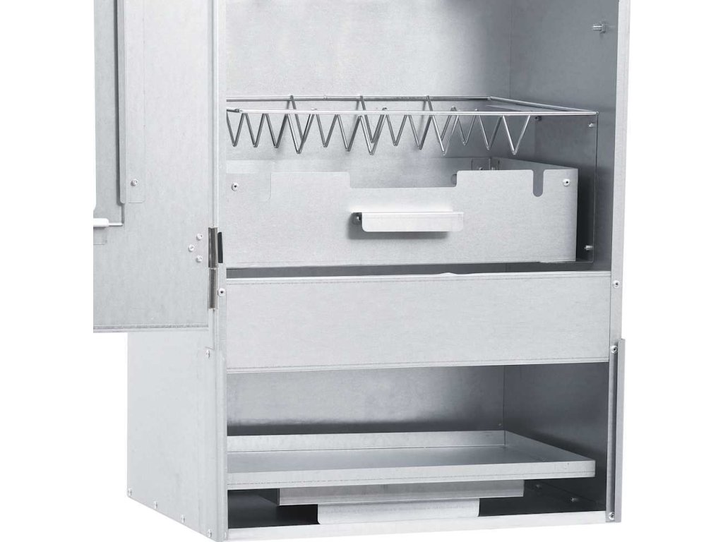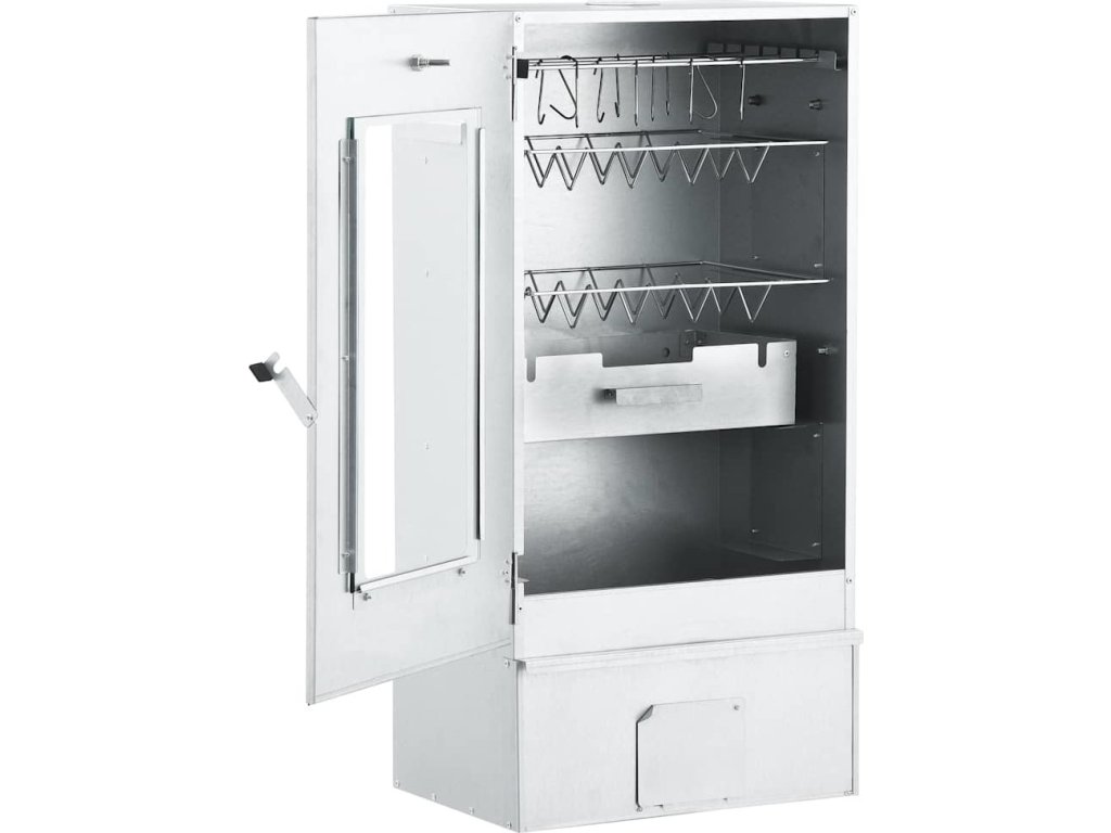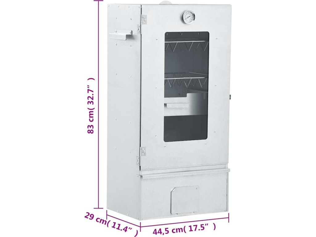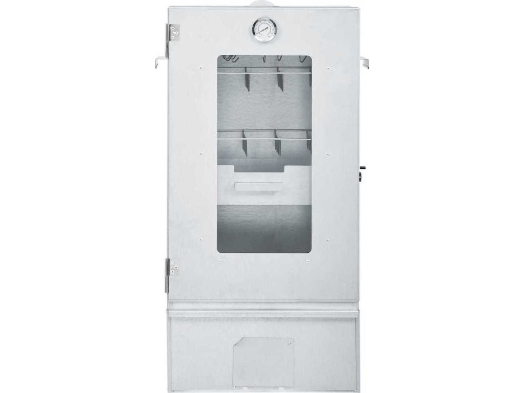 Udírna je vybavená teploměrem, abyste měli neustále přehled o teplotě uvnitř komory. Okénkem můžete rovněž kontrolovat připravované jídlo. Udící trouba měří na výšku 83 cm, takže máte spoustu místa na uzení masa.