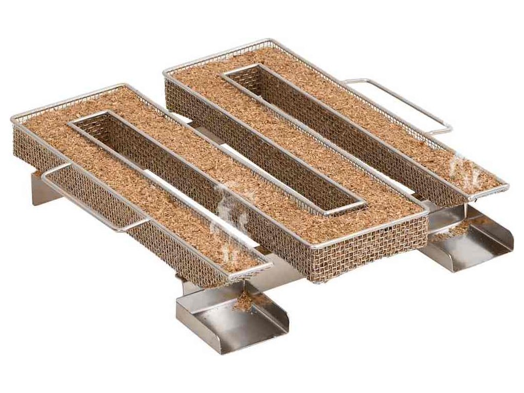 - Generátor studeného kouře: Stačí naplnit pilinami a zapálit čajovou svíčkou, dokud piliny nezačnou měnit barvu. Vyjměte čajovou svíčku a umístěte generátor kouře do udírny. Kompaktní mřížka ve tvaru písmene M umožňuje rovnoměrné a pomalé hoření štěpků po dobu až 10 hodin.