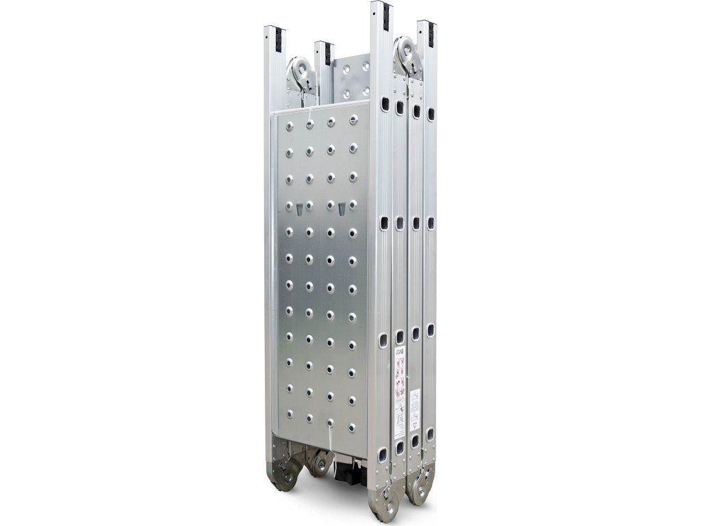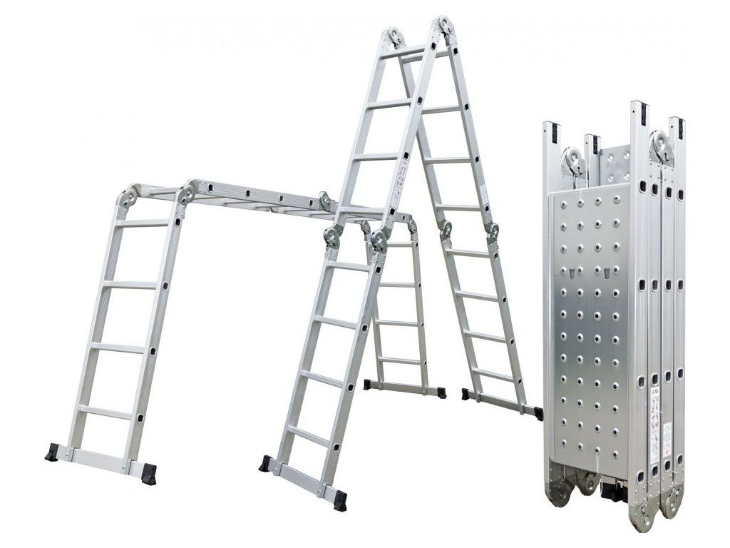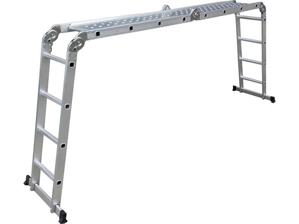 Hliníkové štafle můžete využít jednak jako dlouhý žebřík v délce až 4,6 m. Další variantou je možnost sestavit štafle jako přenosné lešení. Balení obsahuje 2 ks podlážek pro přestavbu štaflí na lešení. Díky konstrukci s klouby lze štafle snadno umístit přes hřeben střechy.