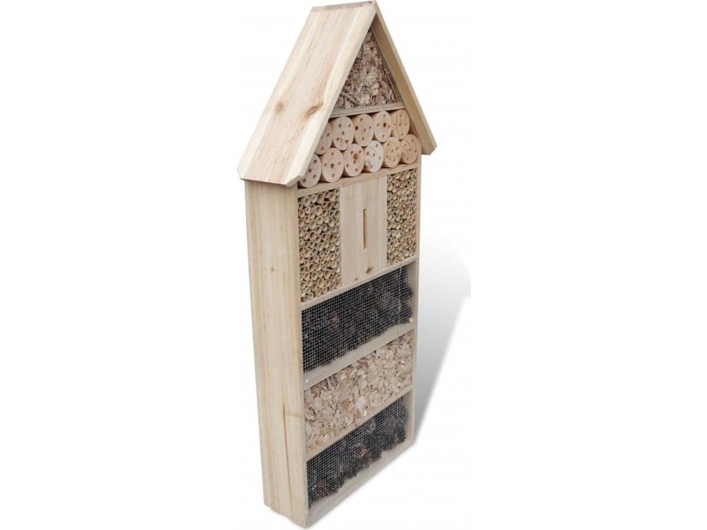 Tento velký hmyzí hotel, vyrobený z klimaticky odolného masivního dřeva, je navržený tak, aby poskytl úkryt nebo útočiště mnoha druhům hmyzu. Vnější část má přirozenou barvu dřeva a v zimě ho můžete využívat jako zimoviště a v létě jako stinné místo pro tato milá zvířátka.