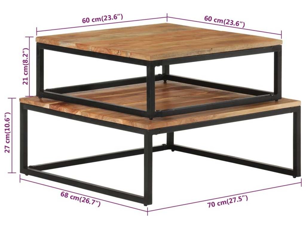 Konferenční stolek je vyrobený z masivního akáciového dřeva s hustou kresbou. Tento krásně designovaný stolek do obývacího pokoje je stabilní, odolný a atraktivní. Zručné zpracování a překrásná kresba dřeva od sebe jednotlivé kusy nábytku lehce odlišují, každý z nich je proto naprostý unikát. Nohy z černě práškově lakovaného železa napomáhají lepší stabilitě a robustnosti stolu. Malý stolek je navíc možné uložit pod větší a ušetřit místo.