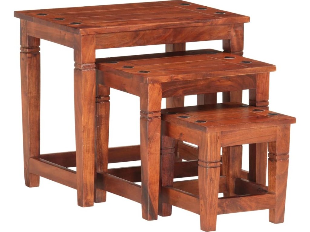 Stohovatelný design těchto stolků ušetří spoustu místa, když je právě nepoužíváte. Tato sada stolků z masivního akáciového dřeva získala leštěním, nátěrem a lakováním povrchovou úpravu ve stylu ořechového dřeva a rafinovaný vzhled. Nádherná kresba dřeva je pokaždé unikátní, a tak se každý kus mírně liší od všech ostatních. Balení obsahuje 3 stolky v různých velikostech.