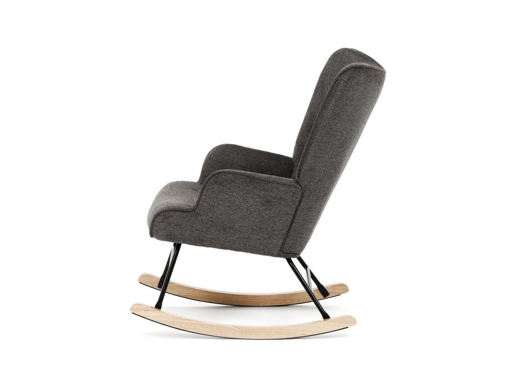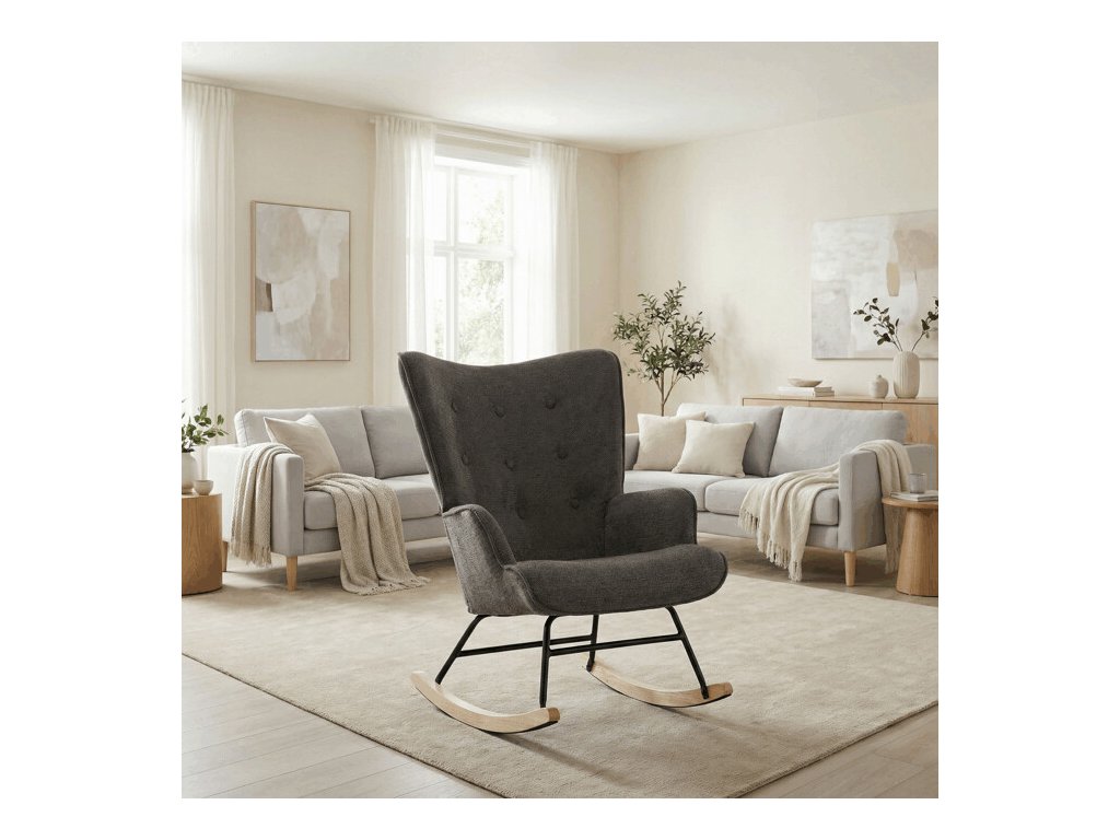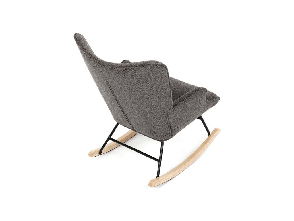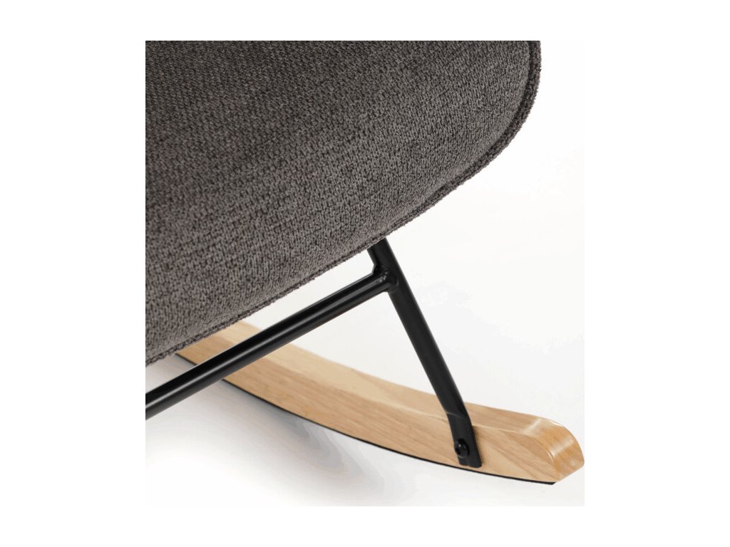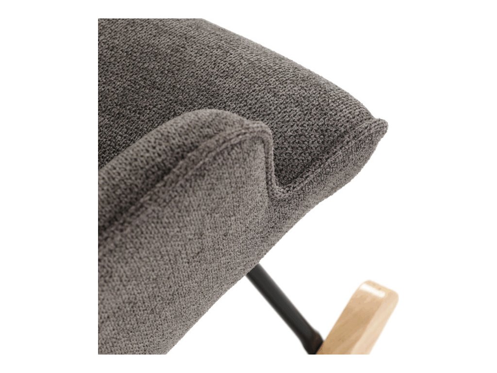 Houpací křeslo v šedé barvě je potažené prémiovou látkou, která nabízí příjemný povrch a snadnou údržbu. Sedák a opěradlo jsou ergonomicky tvarované s decentním prošitím, které dodává křeslu elegantní vzhled. Pevné nohy jsou vyrobeny z kombinace černého kovu a masivního kaučukovníku, což zajišťuje stabilitu a dlouhou životnost. Křeslo je vybaveno houpacím mechanismem, který umožňuje příjemné a plynulé houpání pro relaxaci. Područky jsou pevné a čalouněné stejnou látkou jako sedák, což zvyšuje komfort při sezení.