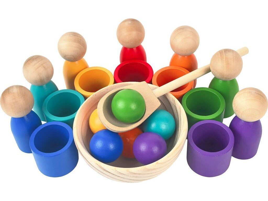 Děti se nejlépe učí prostřednictvím hry. Úkolem je umístit panenky do kalíšků a nasadit jim čepičku podle správné barvy. Nebo nechte panenky odpočívat a použijte kuličky, které je potřeba umístit do kalíšků pomocí lžíce. Pestrobarevné provedení děti motivuje k objevování barev a přináší radost i užitek. Dřevěná hra rozvíjí soustředění, učí manipulaci s předměty a podporuje rozvoj smyslů i fantazie.