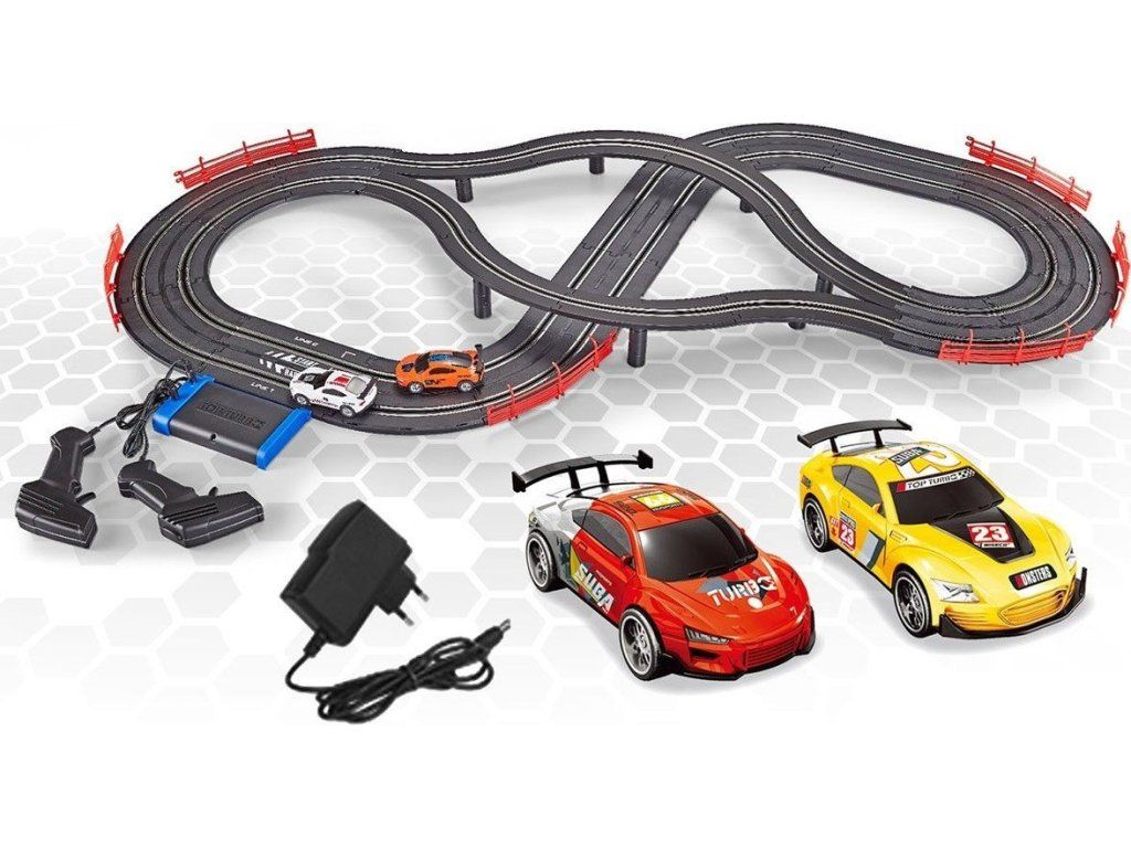 Autodráha Racing collection udělá radost každému malému závodníkovi a nadšenci do autíček. Užije si rychlou jízdu a pomocí ovladačů uspořádá se svými sourozenci nebo kamarády závody. Stačí sestavit trať a vyrazit. Balení obsahuje 2 závodní auta, 2 ovladače s EU adaptérem pro externí napájení, most a další příslušenství. Celková délka trati je 440 cm. Kdo pojede rychleji, objede kolečko jako první a vyhraje?
