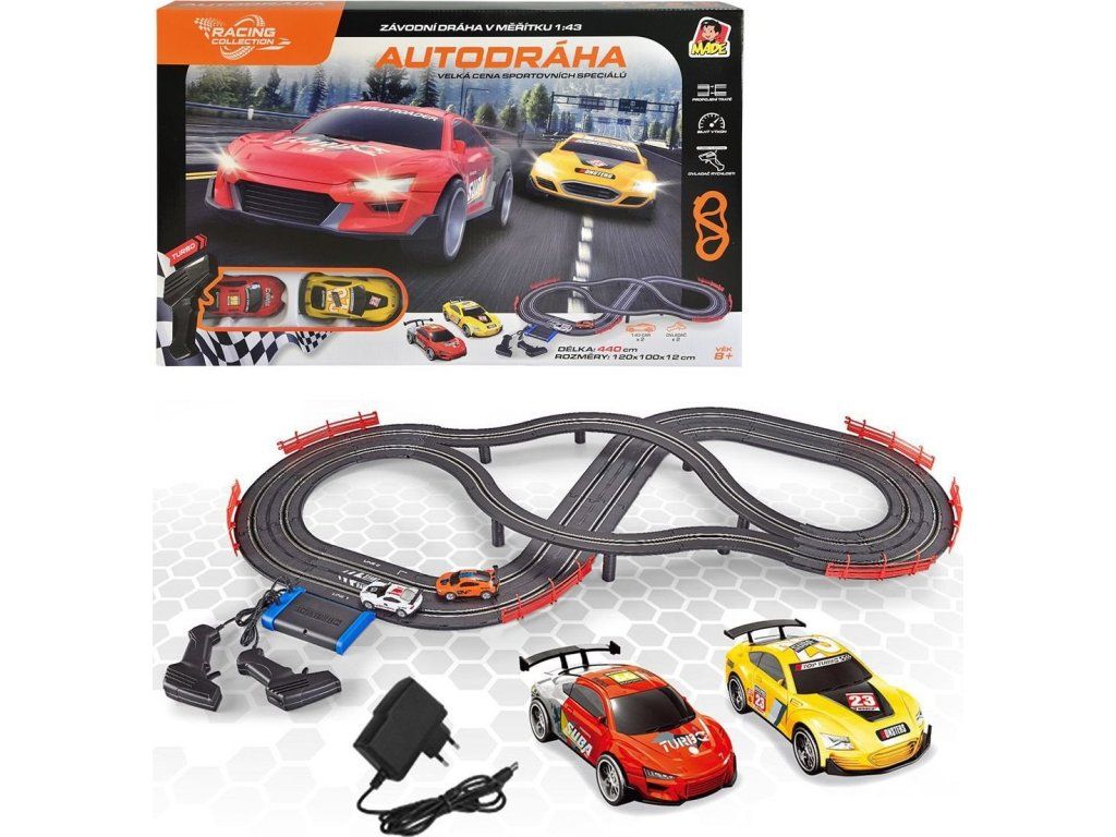 Hračka MaDe Autodráha, 2 auta, 2 ovladače, s EU adaptérem, délka trati 440 cm, 120 x 100 x 12 cm [6951831]