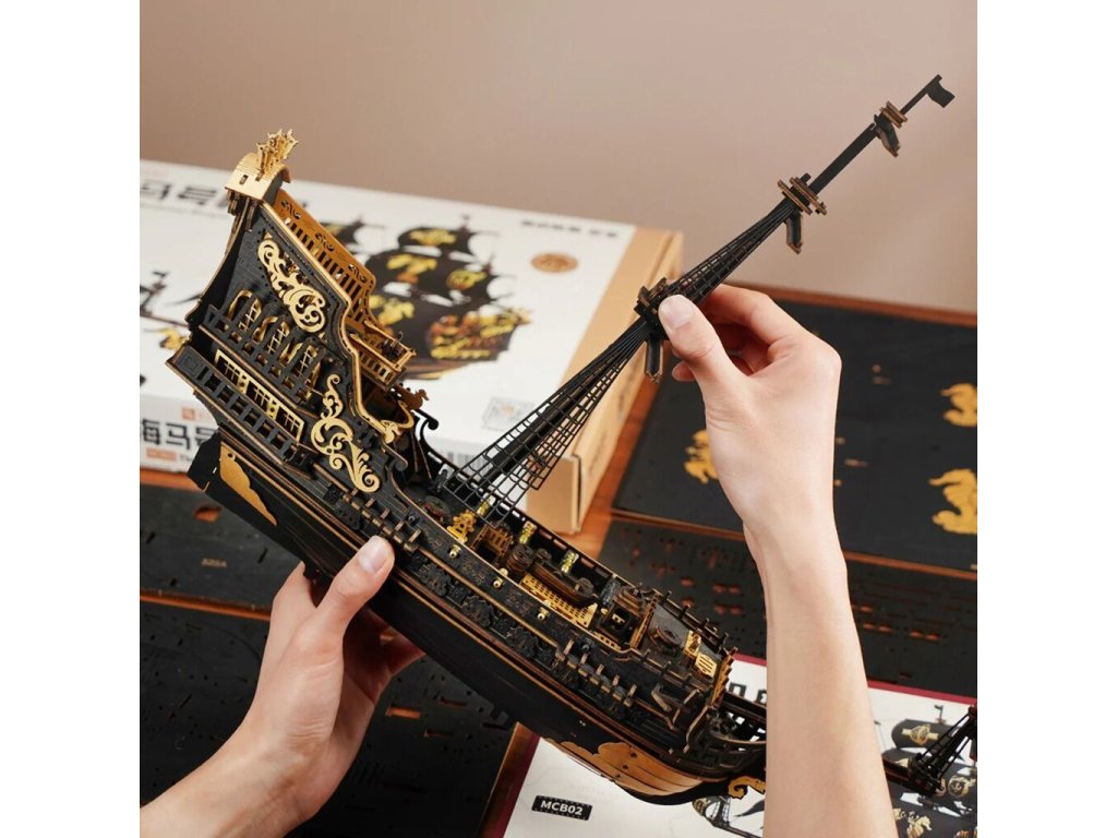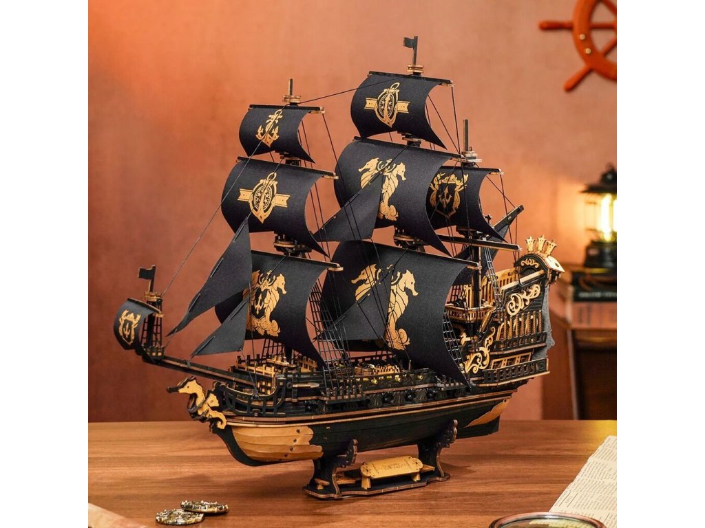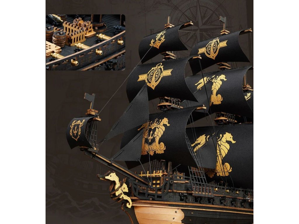 Robotime 3D mechanická skládačka Plachetnice vás přenese do zlatého věku námořních bitev. Elegantní černo-zlatá galeona s funkčním kormidlem a skrytými kanóny okouzlí všechny milovníky modelů lodí i zajímavých dekorací.