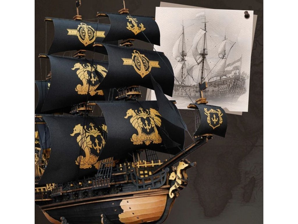 Tato impozantní 3D dřevěná stavebnice vás zavede na palubu barokní válečné lodi inspirované galeonami 16.–18. století. Model disponuje 8 příčnými a 5 podélnými plachtami, výrazným mořským koníkem na přídi a řadou lesklých děl. Jedinečnou funkcí je posuvný díl na palubě, kterým aktivujete 26 skrytých kanónů. To vše dotváří realistický vzhled, který ocení každý nadšenec do lodí i detailního modelářství.