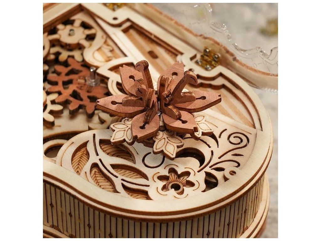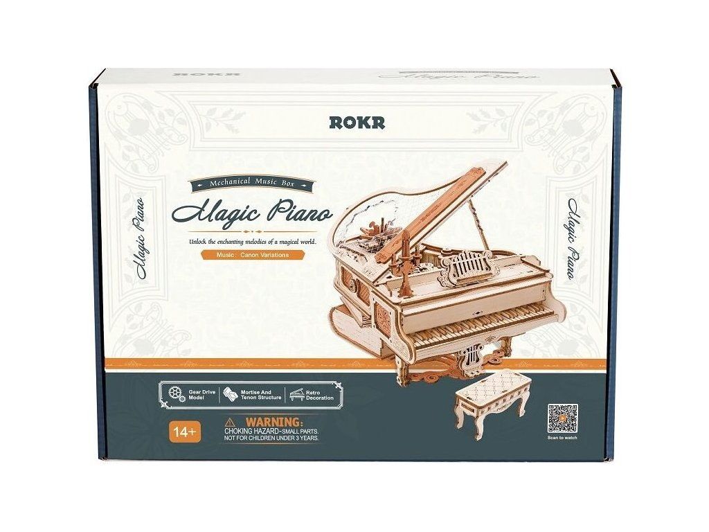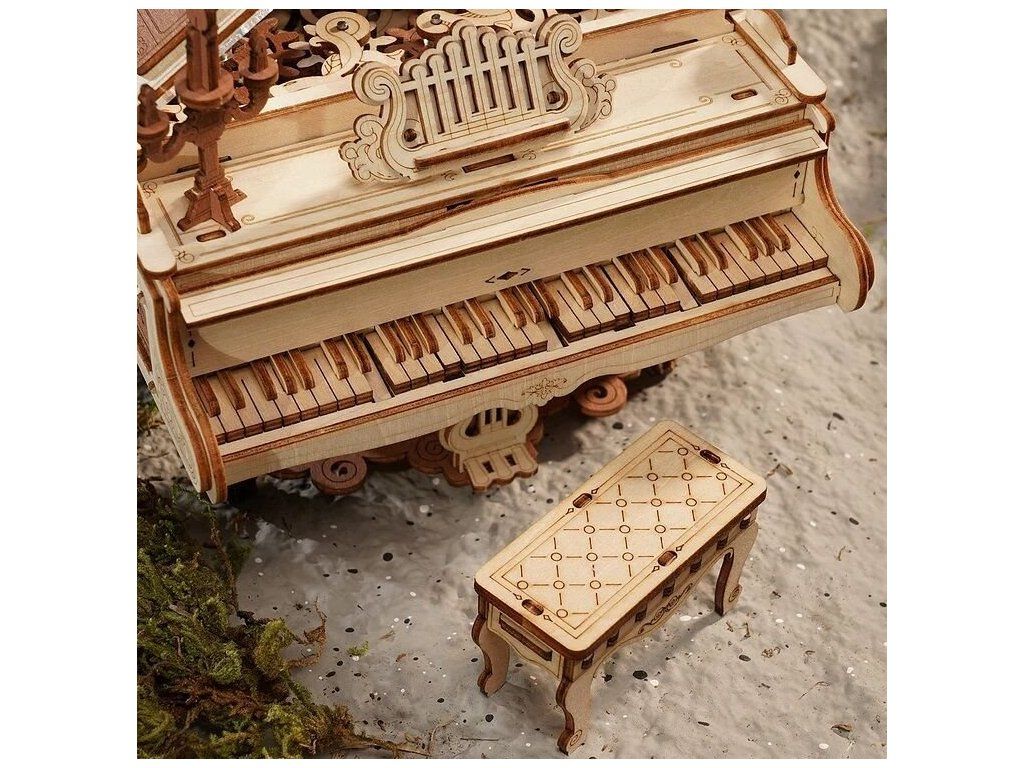 Ponořte se do kouzelného světa magických melodií s mechanickou hrací skříňkou "Magic piano" – 3D dřevěné mechanické puzzle RoboTime Dřevěné mechanické puzzle Kouzelné piáno (mechanický pohon). Jemný model potřebuje vaši trpělivost a soustředění. Je to praktický způsob, jak procvičit logické myšlení a jemné motorické dovednosti. Podporuje trpělivost, ale výsledná práce stojí za to. Dodáváno v nesloženém stavu s podrobným návodem k sestavení. Jednoduchým navinutím klíče se uvedou ozubená kola do pohybu a začne hrát hudba. Nastává tak fascinující tanec propojených mechanismů a hudby.