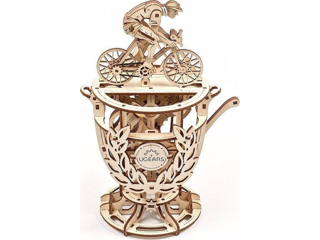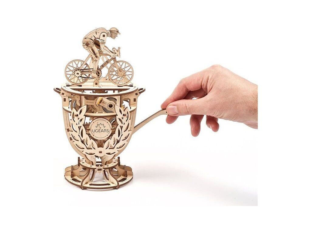 Po seskládání získáte cyklistu na kole umístěného na horní straně poháru. Rozpohybujete ho pomocí páky. Dopřejte si pohled na propracovaný mechanismus a upravujte délku jízdy pomocí mincí a žetonů. Ty vložíte do ramen setrvačníku a pozorujete změnu chování vašeho cyklisty. Naučte své děti, jak setrvačník funguje, nebo obdarujte touto skládačkou nadšence do cyklistiky.