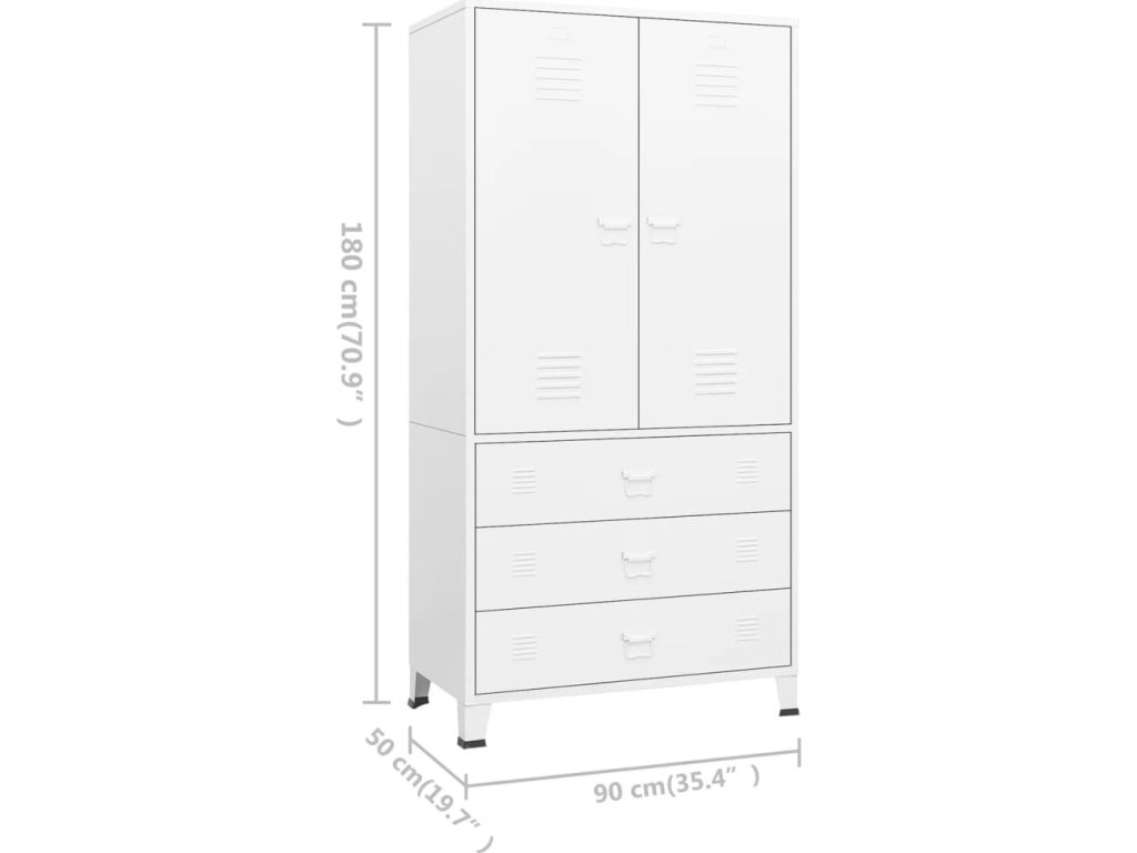 Šatní skříň je vyrobena z kovu, takže je odolná a snadno se čistí. Je vybavena 2 policemi a 1 tyčí k zavěšení ramínek. Velké přihrádky vám nabídnou dostatek úložného prostoru jak pro zavěšení delších oděvů, tak k uložení složeného oblečení, jako jsou svetry či džíny, a menších doplňků, například klobouků, kabelek atd. Skříň je vybavena štítky na dveřích a větracími otvory, což umožňuje přehledné třídění věcí a zároveň podtrhuje její industriální vzhled. Navíc se snadno čistí vlhkým hadříkem.