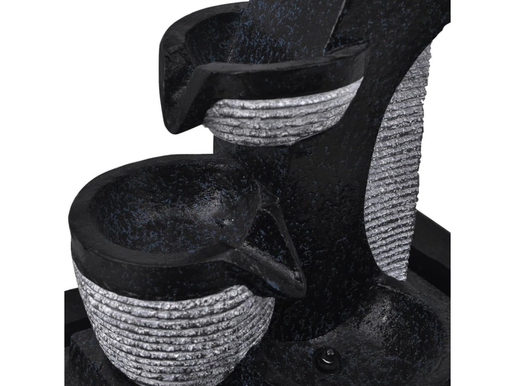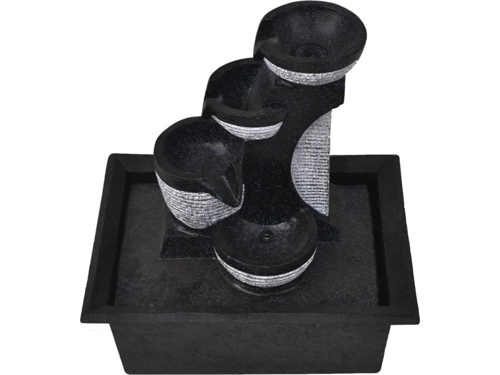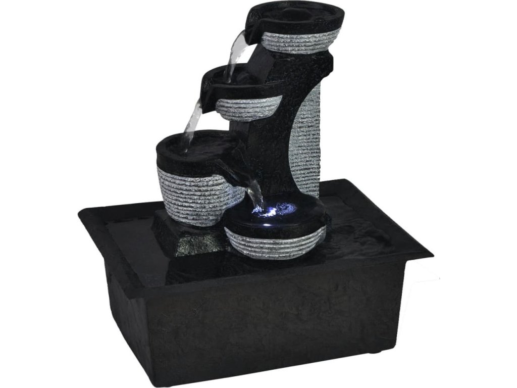 Tento prvek s tekoucí vodou se bude hodit do každého stylu zařízení. Má čtyřúrovňovou vodní kaskádu a je osvětlen LED diodami, což vytváří úchvatný vizuální efekt, obzvláště v noci. Tato fontána je vyrobena z polyresinu (syntetická pryskyřice) a je odolná vůči UV záření, což znamená, že bude vypadat stále dobře a uchovávat si svou barvu, i když ji umístíte na přímé sluneční světlo. Několik pramínků a uklidňující zvuk tekoucí vody navozuje relaxační a meditativní atmosféru. Přiložené vysoce kvalitní čerpadlo zajišťuje bezpečné a spolehlivé používání.
