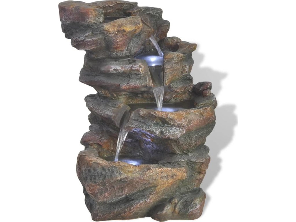 Tento prvek s tekoucí vodou se bude hodit do každého stylu zařízení. Má čtyřúrovňovou vodní kaskádu a je osvětlen LED diodami, což vytváří úchvatný vizuální efekt, obzvláště v noci. Tato fontána je vyrobena z polyresinu (syntetická pryskyřice) a je odolná vůči UV záření, což znamená, že bude vypadat stále dobře a uchovávat si svou barvu, i když ji umístíte na přímé sluneční světlo. Několik pramínků a uklidňující zvuk tekoucí vody navozuje relaxační a meditativní atmosféru. Přiložené vysoce kvalitní čerpadlo zajišťuje bezpečné a spolehlivé používání.