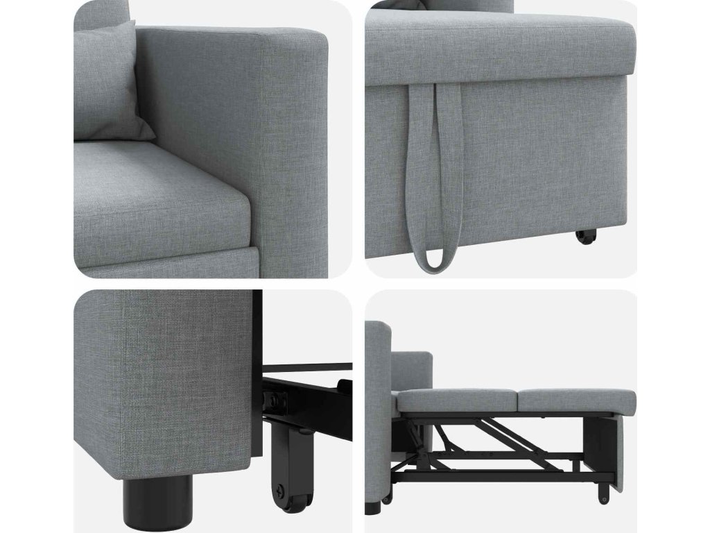 Tato 3-v-1 pohovka spojuje styl a funkčnost, a je tak ideální pro moderní byty. Elegance a praktické vlastnosti ji činí výbornou volbou do malých prostorů. Je navržena tak, aby vynikla v jakékoliv místnosti, přičemž poskytuje variabilitu díky přechodnému designu, a stává se stylovým srdcem vašeho domova. S atraktivním povrchem a pohodlným sezením vás zve k odpočinku a zároveň si zachovává elegantní vzhled. Perfektní pro ty, co potřebují flexibilní nábytek, který snadno změní formu z křesla na postel bez obětí na styl nebo pohodlí.