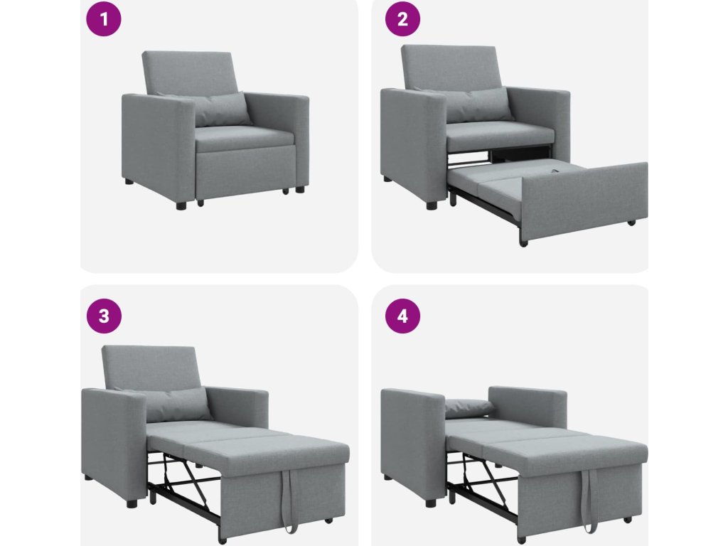 - Funkce/design: S jednoduchým mechanismem 3-v-1 snadno přechází mezi křeslem, polohovacím křeslem a postelí. Je ideální pro menší prostory, kde šetří místo a přitom vypadá skvěle. Čisté linie a minimalistický design ladí s moderním stylem.