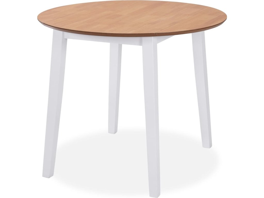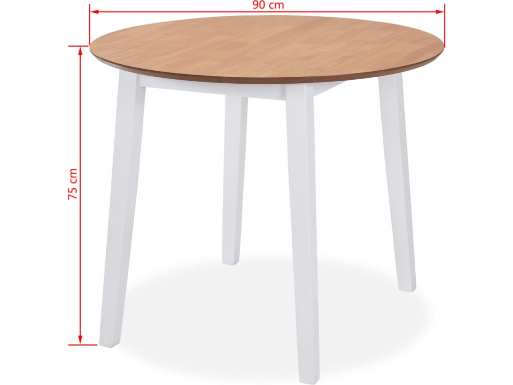 Tento jídelní set má klasický design v sofistikované kombinaci bílé barvy a přírodního dřeva. MDF usnadňuje čištění stolu a masivní kaučukovníkové dřevo přispívá ke stabilitě noh. Dřevo bylo opatřeno olejovým nátěrem, který mu dodává bohatou, teplou barvu. Strany jídelního stolu mohou být sklopeny dolů a židle se dají zasunout pod stůl, abyste ušetřili místo, když set zrovna nepoužíváte.