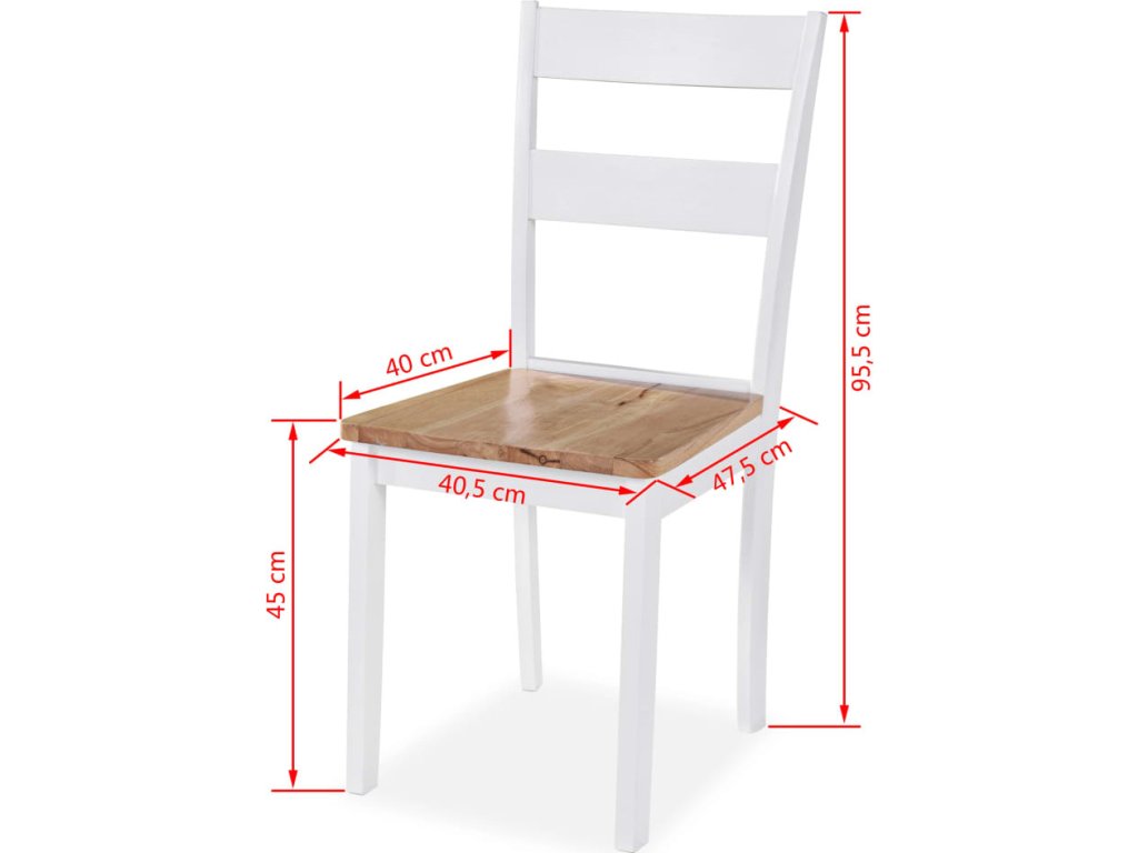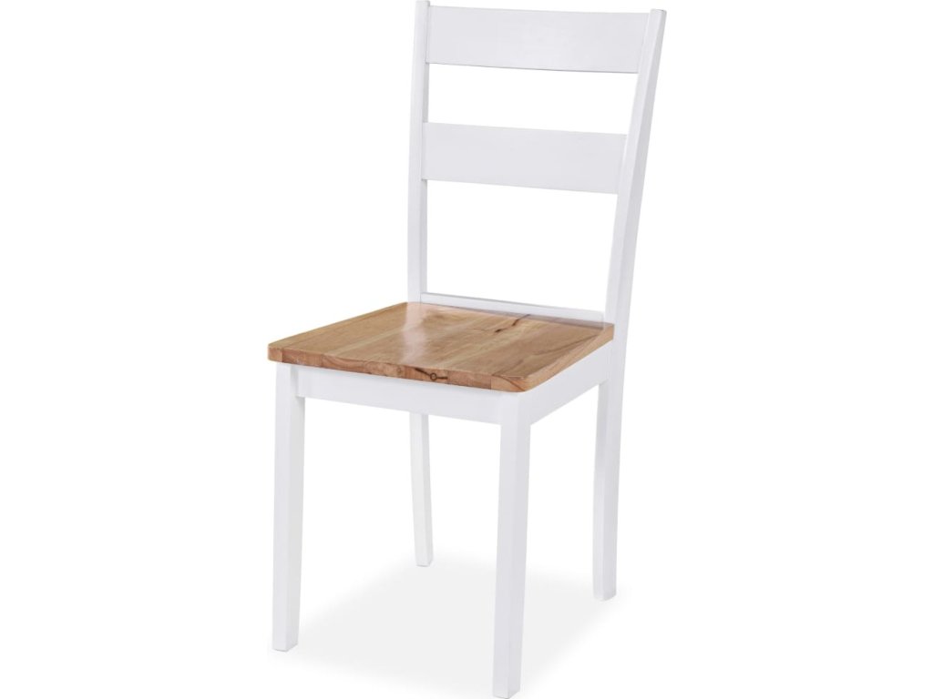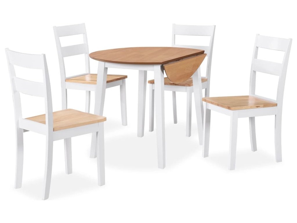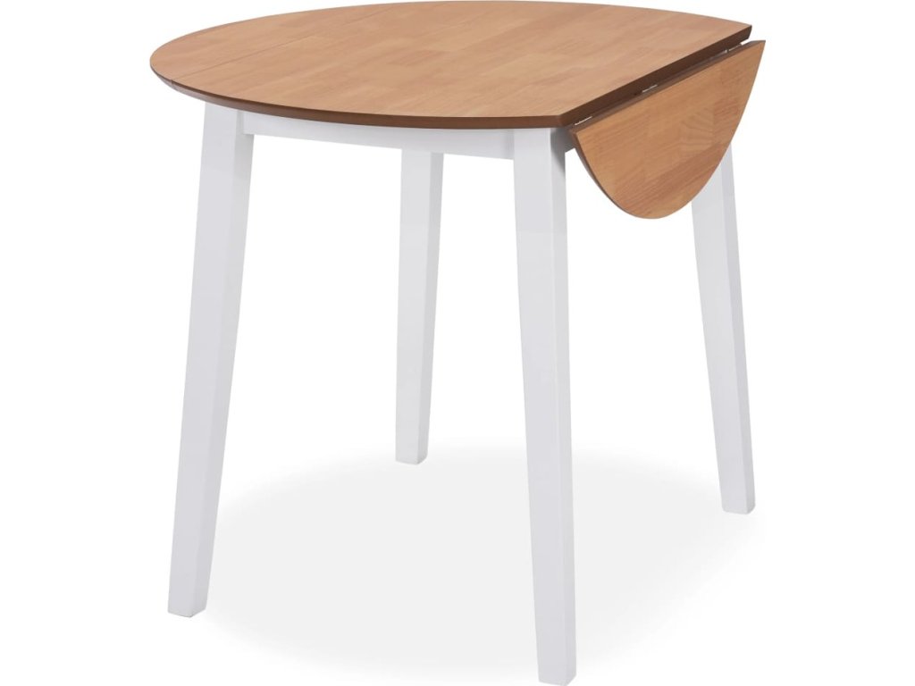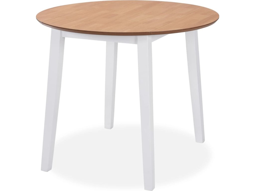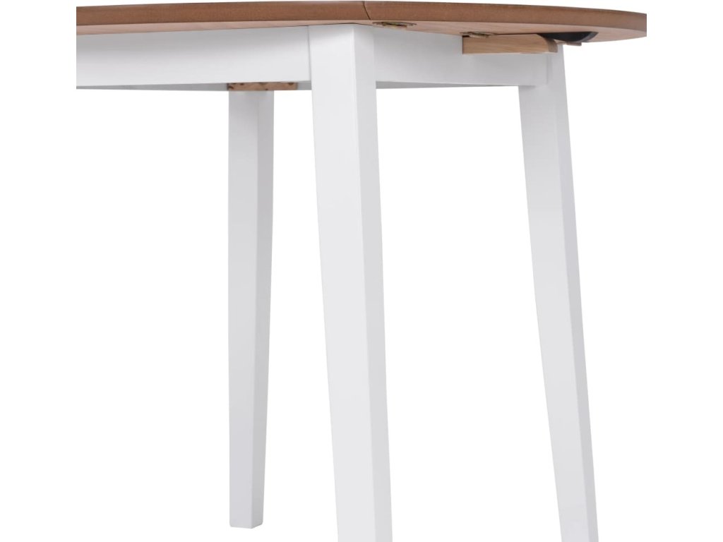 Tento jídelní set má klasický design v sofistikované kombinaci bílé barvy a přírodního dřeva. MDF usnadňuje čištění stolu a masivní kaučukovníkové dřevo přispívá ke stabilitě noh. Kaučukovník byl opatřen nátěrem, který mu dodává bohatou, teplou barvu. Strany jídelního stolu mohou být sklopeny dolů a židle se dají zasunout pod stůl, abyste ušetřili místo, když set zrovna nepoužíváte.