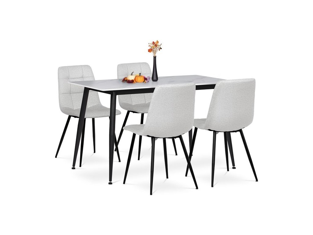 Jídelní set 1+4 kombinuje moderní design s praktickým provedením vhodným pro každodenní použití. Stůl je vybaven deskou z bílého slinutého kamene s mramorovým dekorem, která nabízí pevný a snadno udržovatelný povrch odolný proti poškrábání a teplu. Černá kovová podnož stolu zajišťuje stabilitu a dlouhou životnost. Čtyři židle jsou čalouněné bílou látkou s designovým prošitím na opěradle, které dodává celku elegantní vzhled a zároveň podporuje pohodlí při sezení. Židle mají pevné kovové nohy v černé barvě, které ladí se stolem a zaručují stabilitu. Set je ideální pro menší jídelny či kuchyňské kouty.