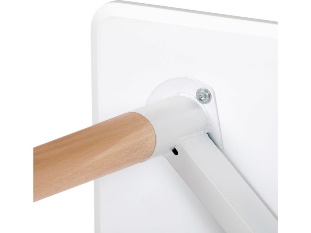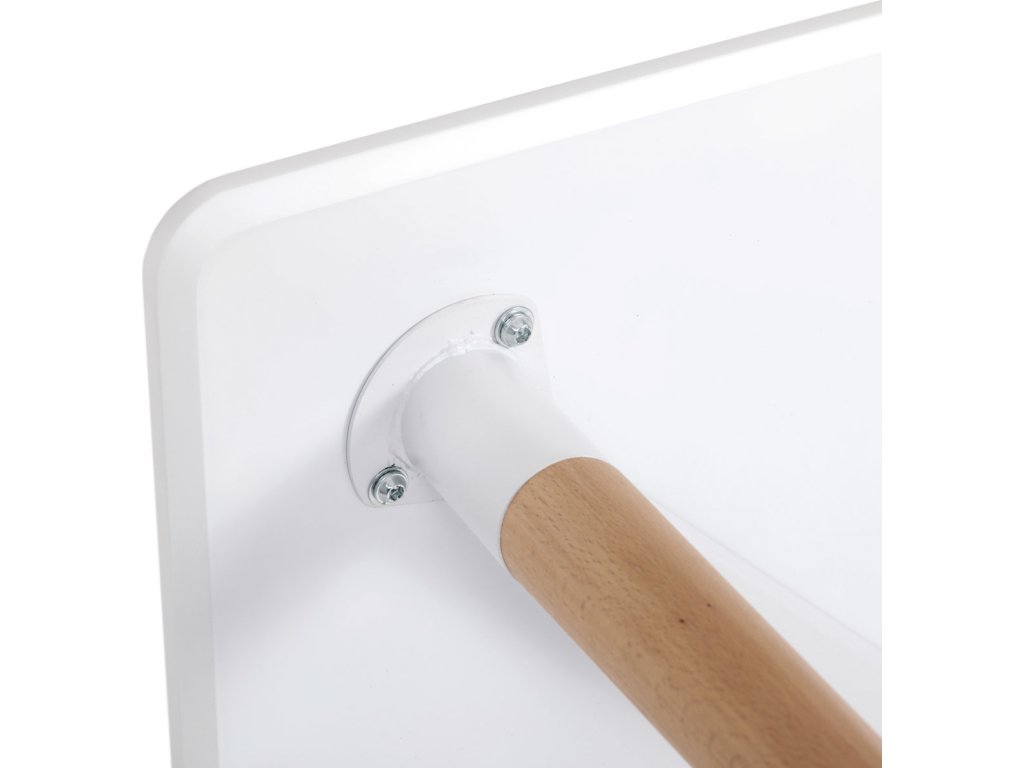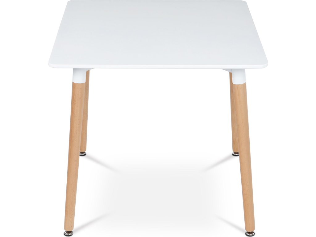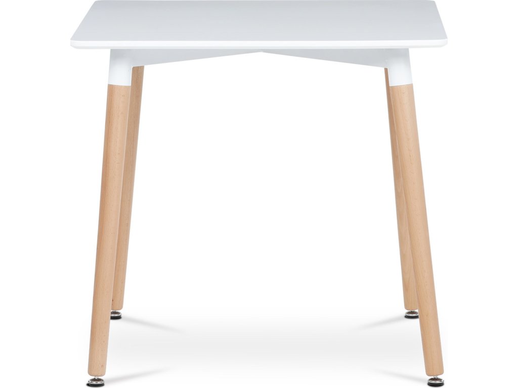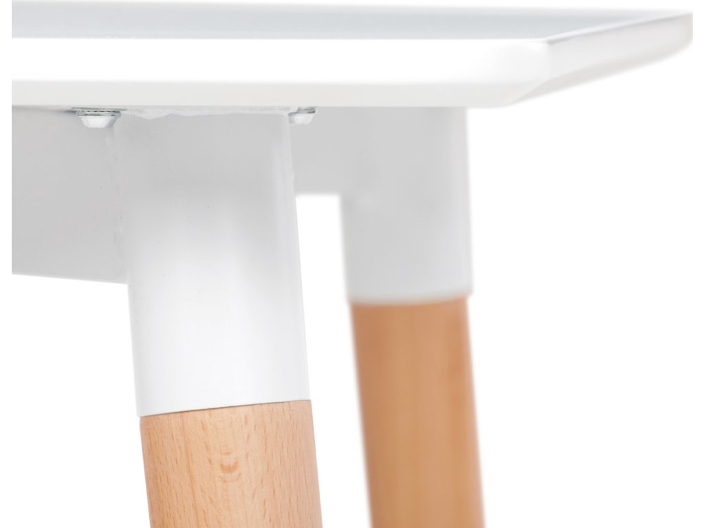 Jídelní stůl o rozměrech 80x80x74 cm zaujme kombinací bílého matného MDF povrchu desky a nohou z masivního dřeva, které dodávají stabilitu a přírodní vzhled. Deska stolu je opatřena matnou povrchovou úpravou, která usnadňuje údržbu a minimalizuje odlesky. Zaoblené rohy přispívají k bezpečnosti a zároveň podtrhují moderní design. Rektifikační nohy umožňují vyrovnání stolu na nerovném povrchu, což zajišťuje pevné a stabilní postavení. Celková konstrukce spojuje pevnost kovových spojů s estetickou hodnotou dřevěných prvků.