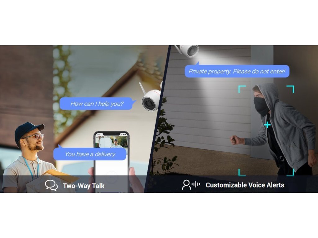 Vstoupil na váš pozemek poslíček s balíčkem nebo nečekaný host? Promluvte na něj. Kamera vám umožní obousměrnou komunikaci pomocí smartphonu. Kromě toho snadno nahrajete až 10vteřinovou zprávu, která se automaticky přehraje při detekci pohybu. Pokud kamera zaznamená narušitele, spustí hlasitou sirénu a zabliká reflektory. Varuje ho a odežene pryč.