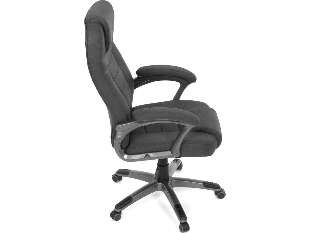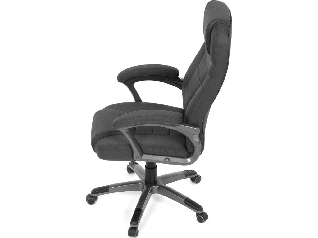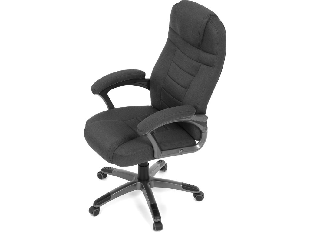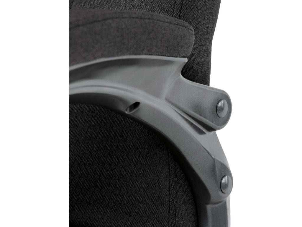 Kancelářské křeslo v černé látce nabízí vysoký opěrák s pevnou opěrkou hlavy a vyměkčenou vrchní částí pro zvýšený komfort při dlouhodobém sezení. Pevné čalouněné područky jsou integrovány do šedého plastového rámu, který spolu s plastovým křížem zajišťuje stabilitu a lehkost. Houpací mechanismus umožňuje příjemné naklánění s možností aretace v základní poloze, zatímco výškově nastavitelná sedací plocha umožňuje přizpůsobení výšky podle potřeby uživatele. Kolečka jsou vhodná pro tvrdé povrchy, což zajišťuje snadný pohyb bez poškození podlahy. Celkově je židle navržena pro pohodlné a ergonomické sezení v kancelářském prostředí.