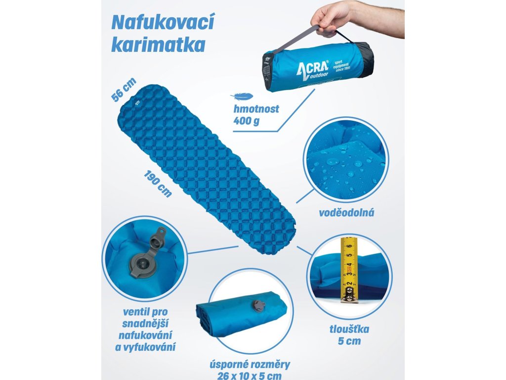 Kempování s karimatkou od značky Acra je příjemné. Oproti klasickým karimatkám vám zajistí pohodlné ležení. Snadno ji kamkoliv přenesete díky nízké hmotnosti. Zároveň je skladná a má dlouhou životnost. Vyhněte se ovšem přímému slunečnímu záření a nadměrným teplotám.