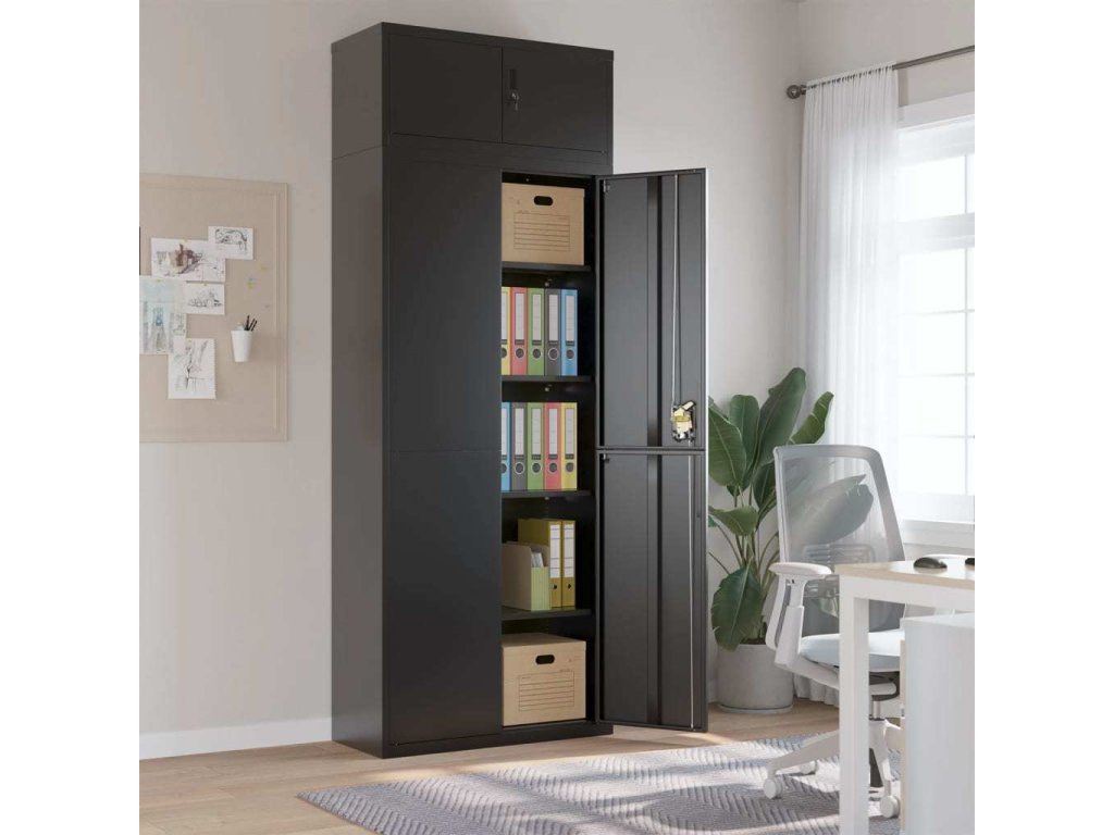 - Nastavitelné police: Skříň je vybavena 4 nastavitelnými policemi, které umožňují přehledné třídění souborů do různých kategorií.