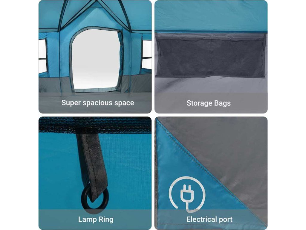 - Prémiové materiály: Tento rodinný stan je z polyesteru s odolným PU pokrytím, které chrání před počasím. Polyester slibuje odolnost vůči UV záření a vodě, takže si stan uchovává kvalitu. Vyztužená konstrukce z oceli zajišťuje stabilitu a odolnost, což z něj dělá spolehlivé místo, i když se počasí nevydaří. Tyto materiály pomáhají prodloužit životnost stanu a omezují potřebu častých výměn.
