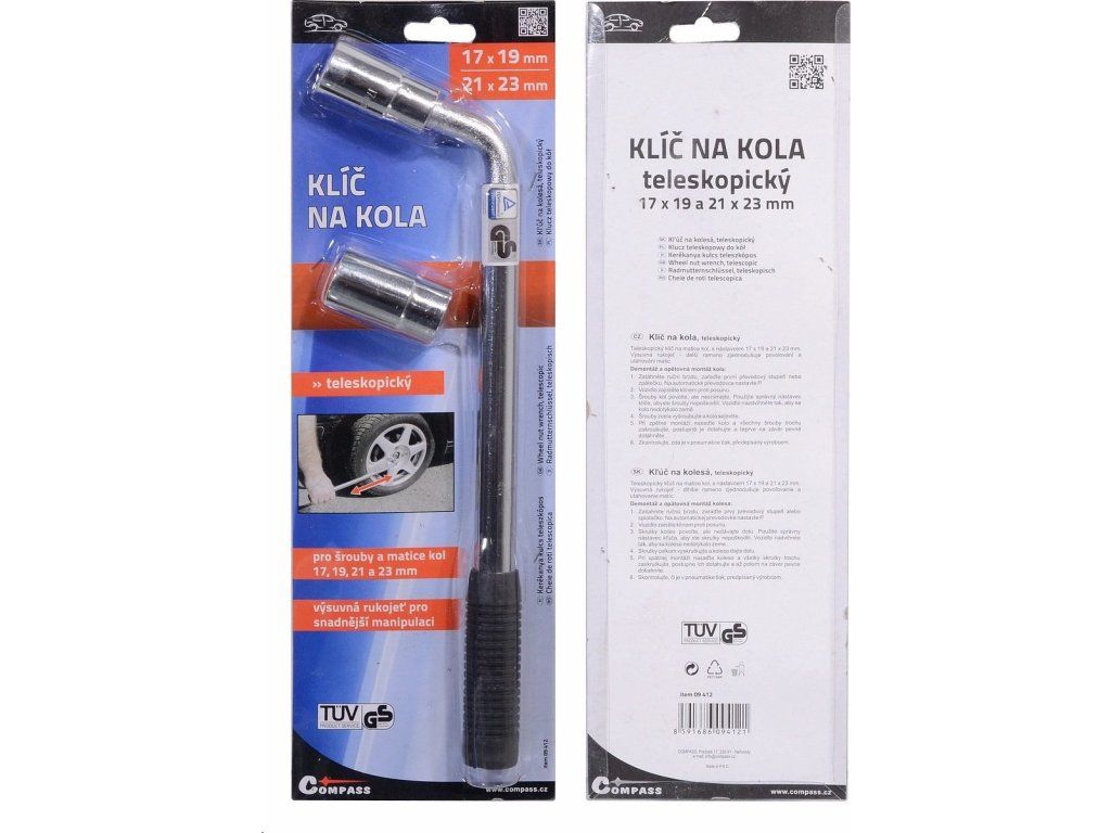Teleskopický kovový klíč ve tvaru písmene L značky Compass je určený pro povolování / utahování matic a šroubů kol automobilů. Na konec nasadíte nástavce o rozměrech 17 / 19 a 21 / 23 mm.