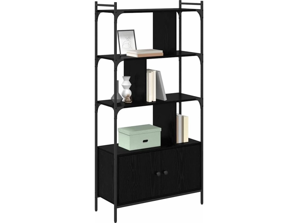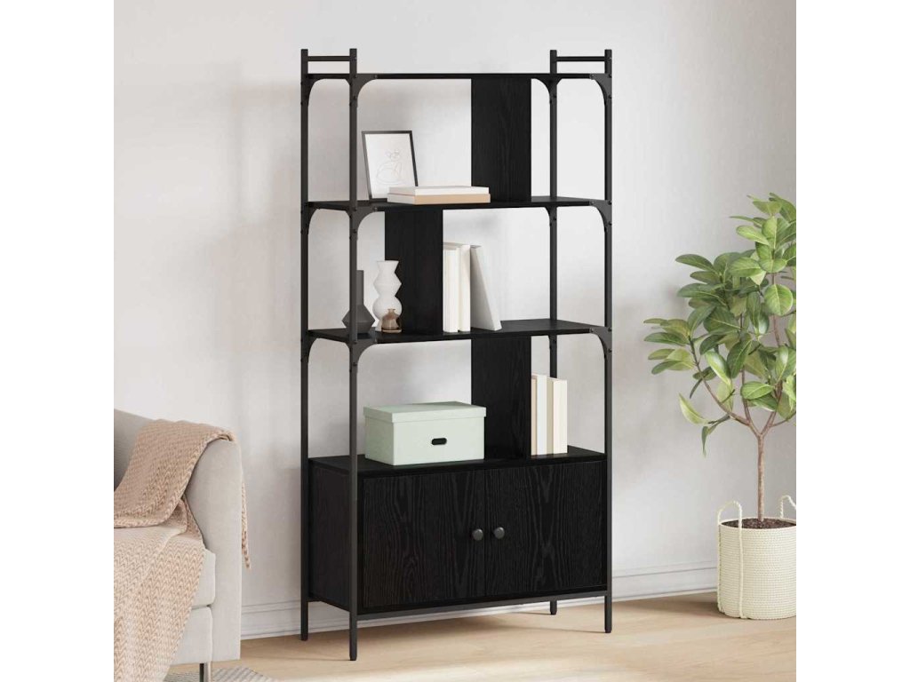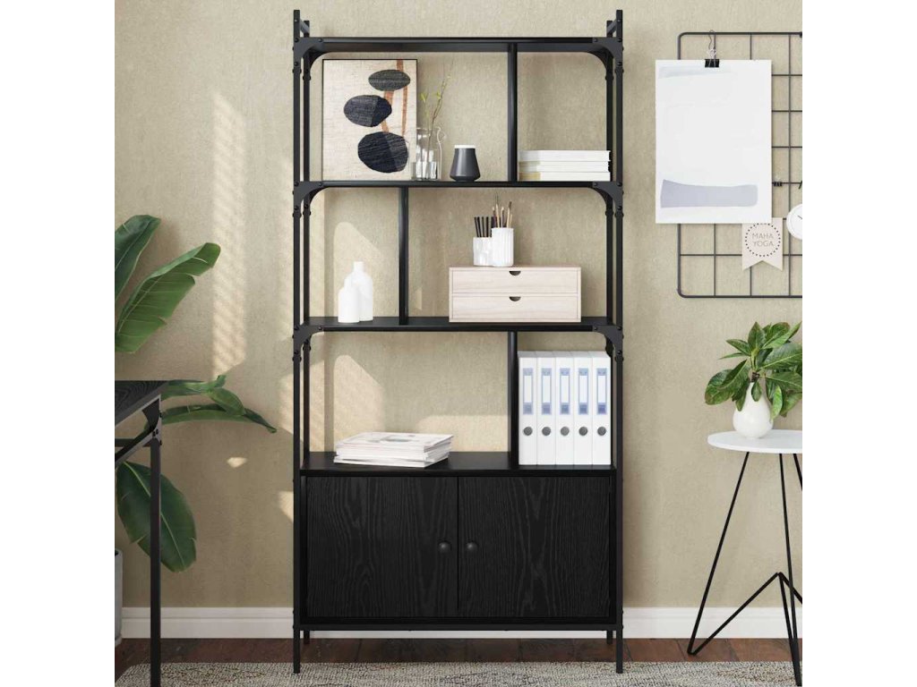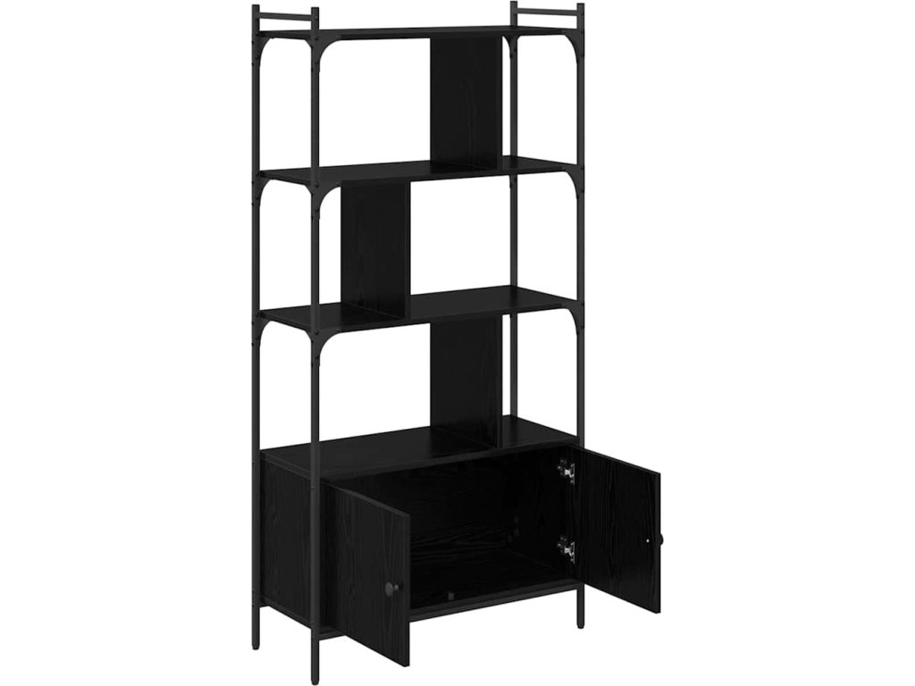 - Dveře na pantech s úchyty: Knihovna má dveře na pantech z inženýrského dřeva s matně černými úchyty, co skvěle fungují a dodávají elegantní vzhled. Tyto součásti zajišťují snadný přístup k uloženým věcem.