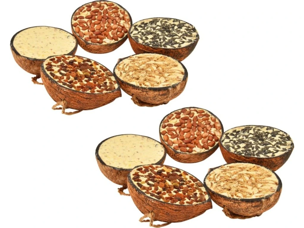 Těchto 10 půlek kokosového ořechu je naplněných směsí ptačího krmiva v 5 různých variantách. Volně žijící ptáčci v nich najdou prémiovou směs tuku a proteinů, která jim dodá potřebnou extra dávku energie.