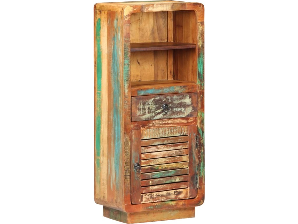 Dřevěná komoda je vyrobená z masivního recyklovaného dřeva s vícebarevnou povrchovou úpravou. Recyklované dřevo pochází z trámů, podlah a podpěrných nosníků starých budov určených k demolici. Sestává tedy z různých druhů dřeva, jako jsou teak, tvrdé dřevo, tropické dřevo, mangovník apod. Recyklované dřevo tak nabývá vlastností všech těchto rozličných typů dřevin. Navíc je již zestárlé, ošlehané a vyschlé, takže se nesmršťuje ani neohýbá. Odkládací skříňka nabízí spoustu úložného prostoru v přihrádce s dvířky, zásuvce a dvou poličkách.