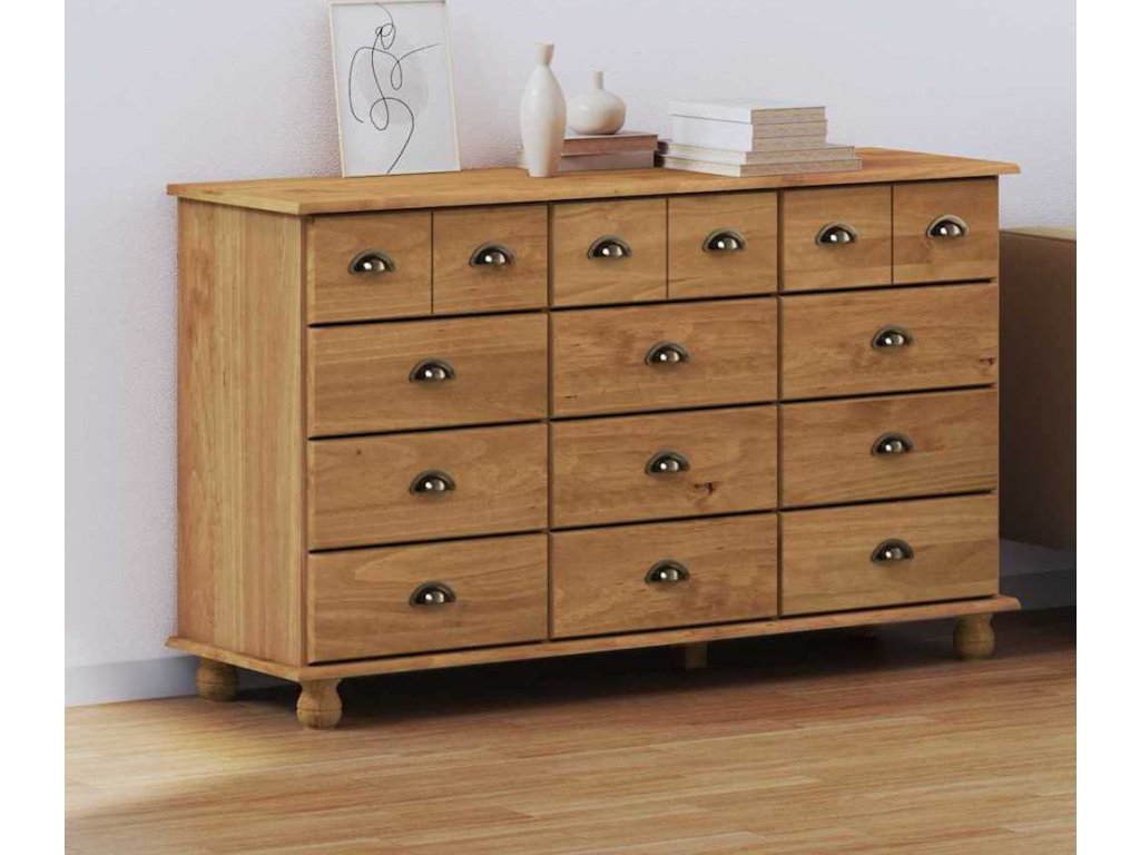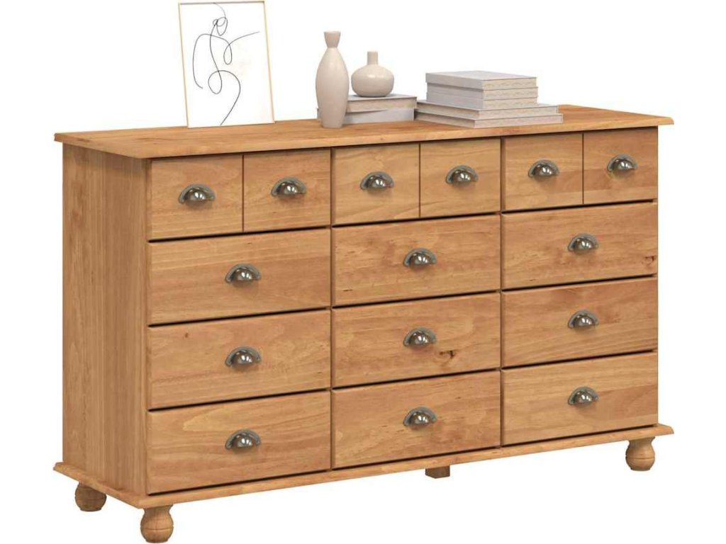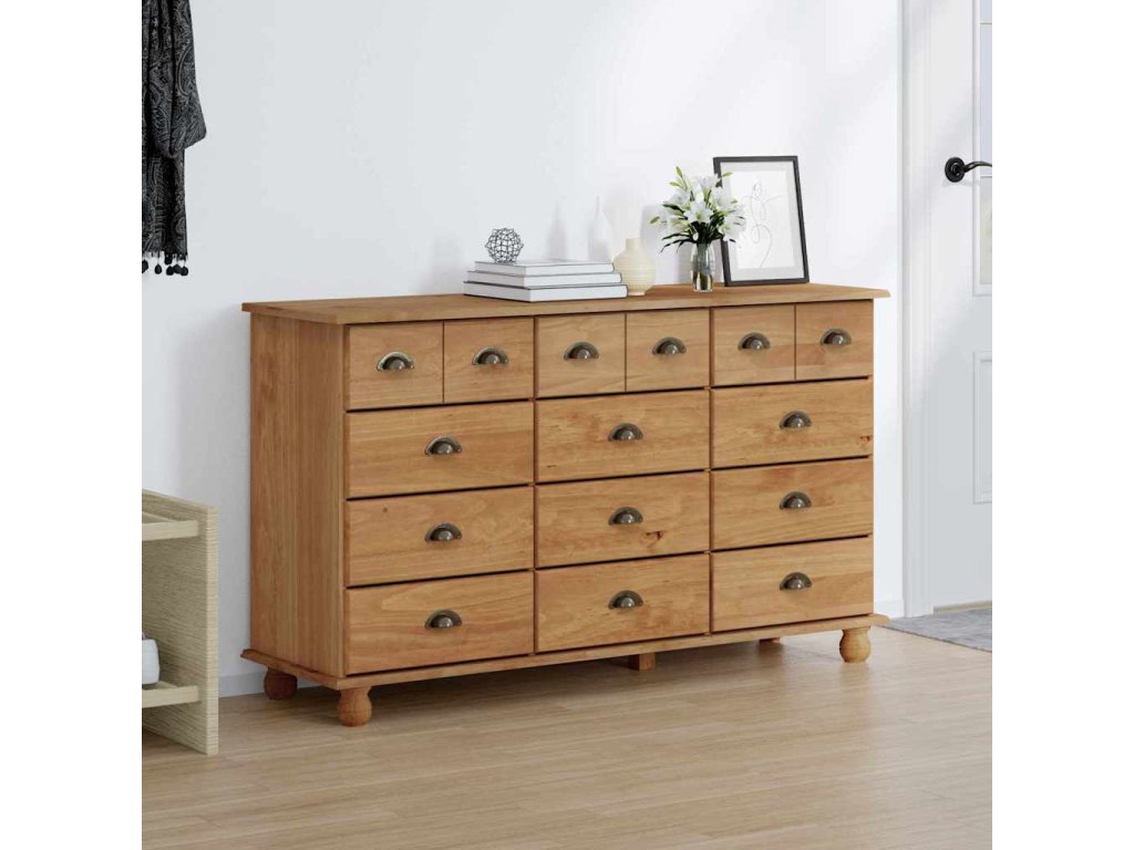 - Masivní borová konstrukce Tato komoda je udělaná z masivního borového dřeva, což jí dodává robustnost a krásný přírodní vzhled. Borové dřevo je silné a má jemnou strukturu, což zajišťuje odolnost a elegance pro moderní interiéry.