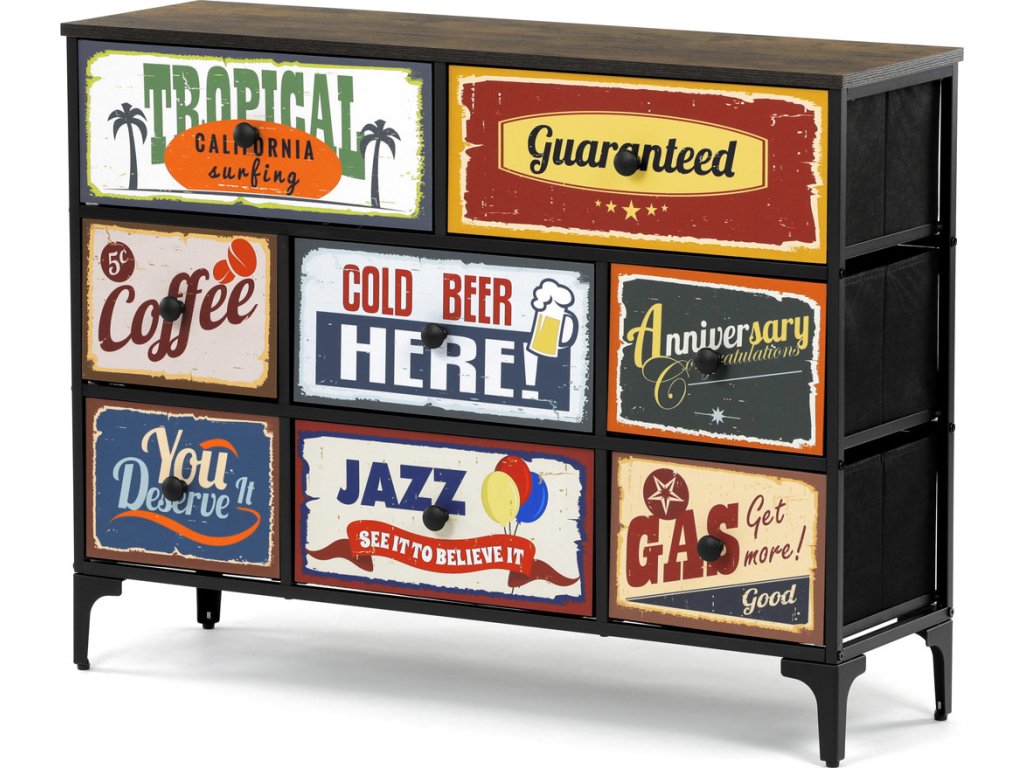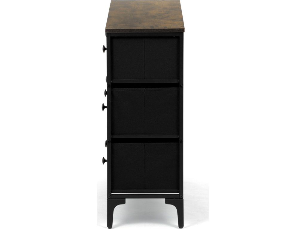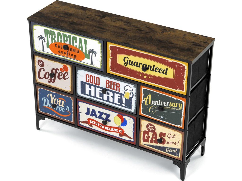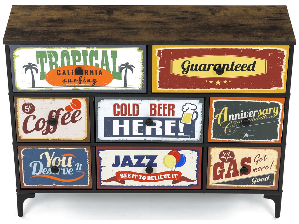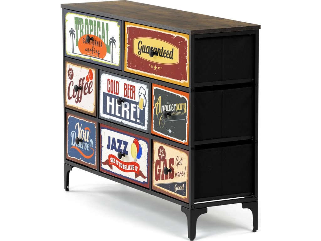 Retro komoda značky Autronic přinese do vašeho interiéru jedinečný styl a originalitu. Textilní čela zásuvek s výplní HDF a vintage potiskem navozují atmosféru starých amerických barů a jazzových klubů. Kombinace černé kovové konstrukce, desky v dekoru starého dřeva a zdobných noh dodává nábytku robustní, ale zároveň elegantní vzhled. Korpus zásuvek je vyroben z netkané textilie s výplní HDF, což zajišťuje jejich lehkost a snadnou manipulaci. Ideální doplněk do obývacího pokoje nebo stylové kavárny, kde se stane nepřehlédnutelným prvkem.