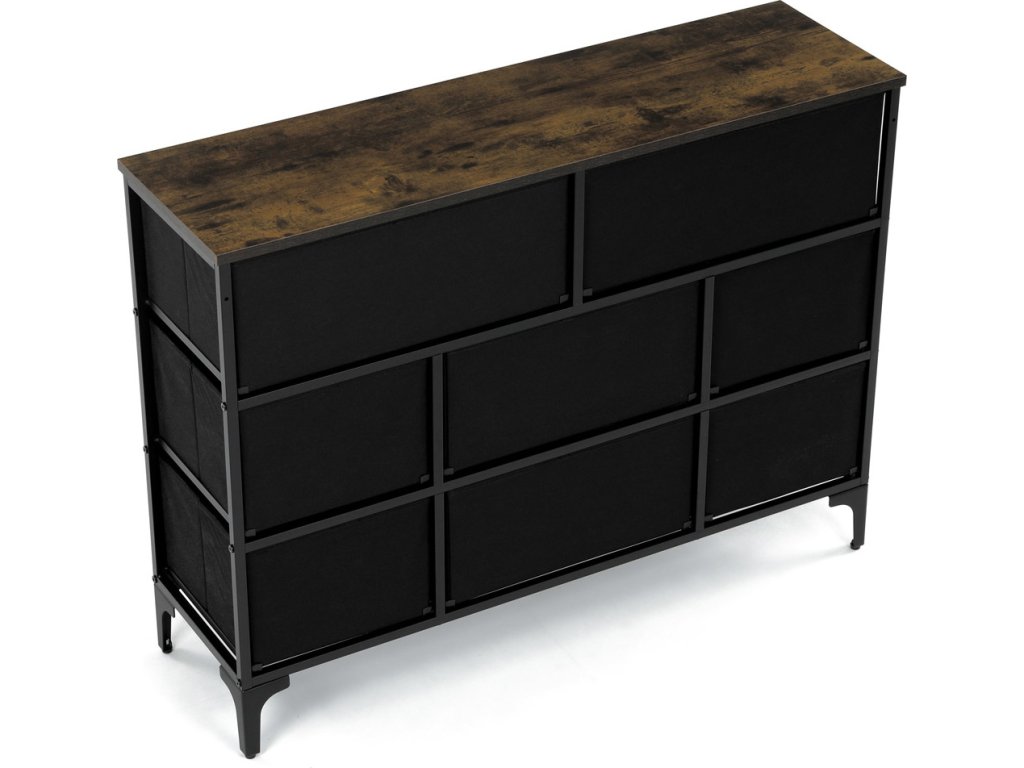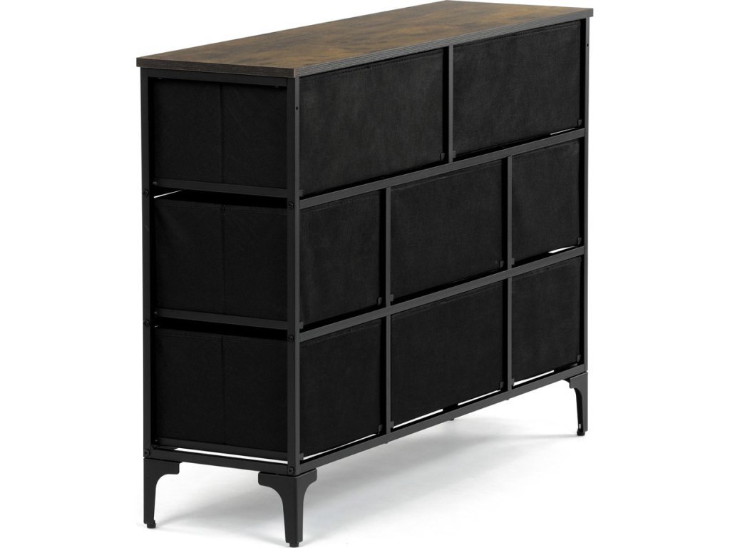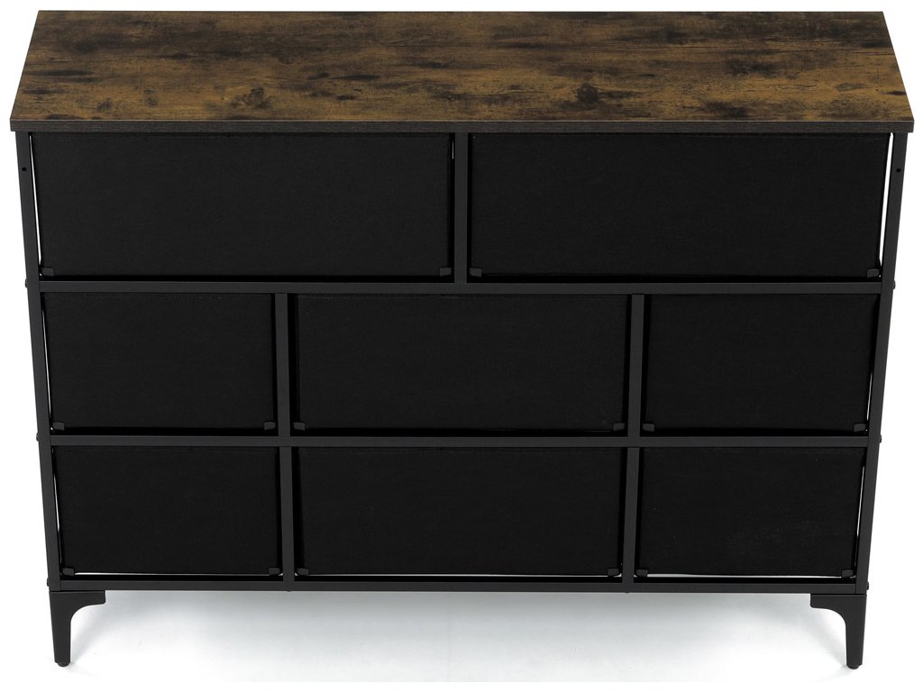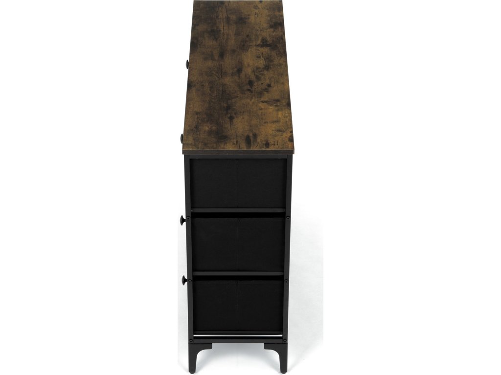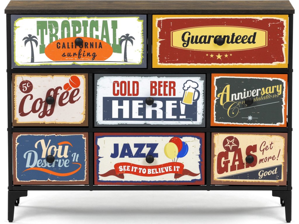 Retro komoda značky Autronic přinese do vašeho interiéru jedinečný styl a originalitu. Textilní čela zásuvek s výplní HDF a vintage potiskem navozují atmosféru starých amerických barů a jazzových klubů. Kombinace černé kovové konstrukce, desky v dekoru starého dřeva a zdobných noh dodává nábytku robustní, ale zároveň elegantní vzhled. Korpus zásuvek je vyroben z netkané textilie s výplní HDF, což zajišťuje jejich lehkost a snadnou manipulaci. Ideální doplněk do obývacího pokoje nebo stylové kavárny, kde se stane nepřehlédnutelným prvkem.