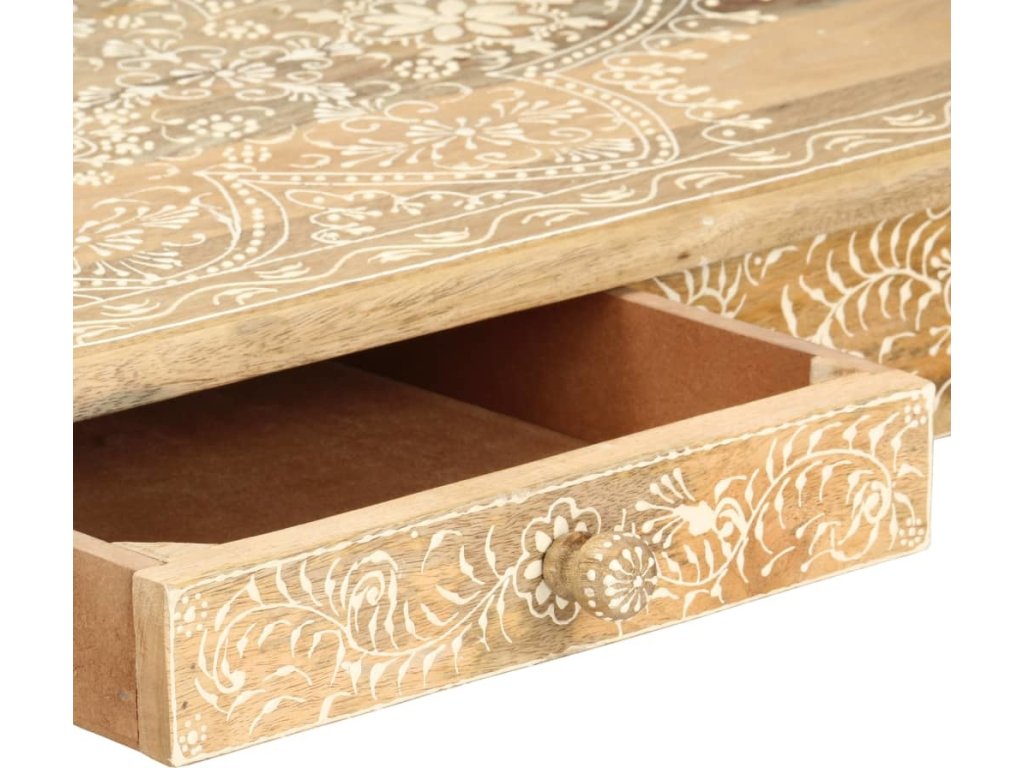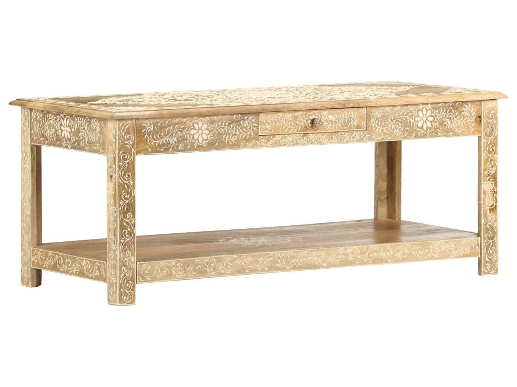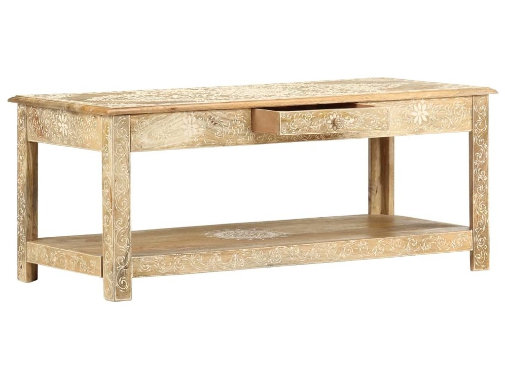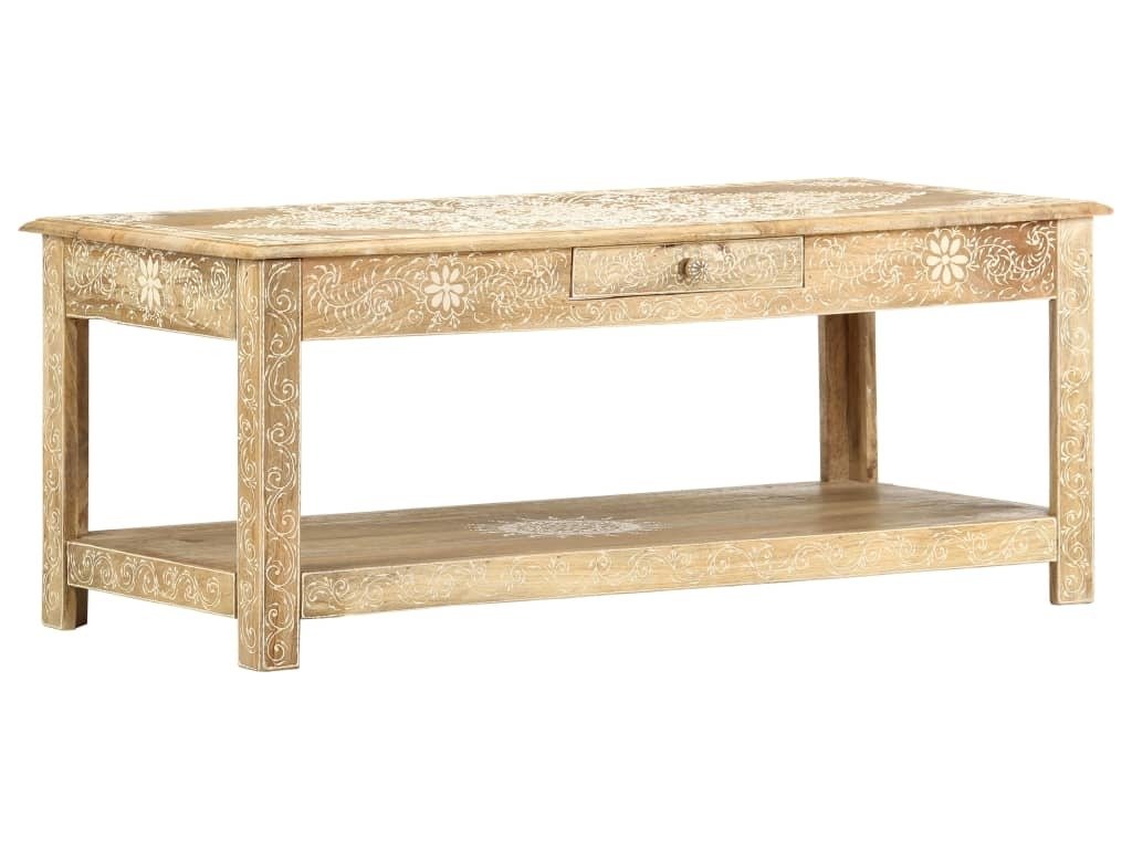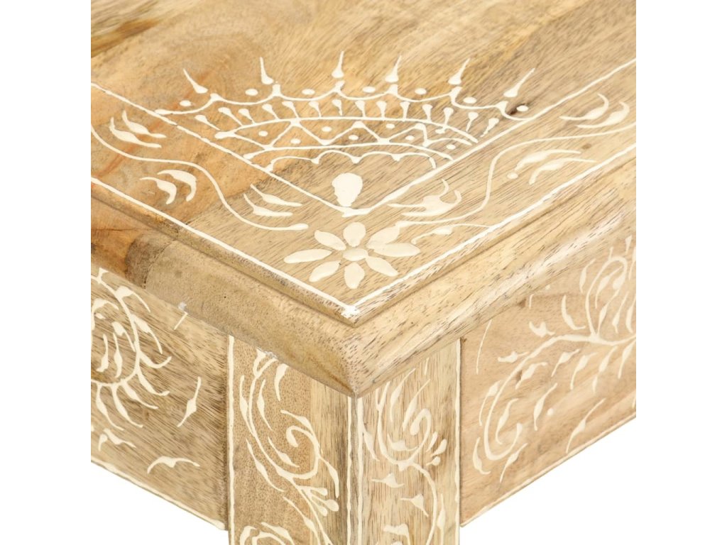 Konferenční stolek je vyrobený z masivního mangovníkového dřeva, které je nejen stabilní a odolné, ale zároveň také krásně vypadá. Navíc ho zdobí ručně malovaný vzor a zručné řemeslné zpracování podtrhuje jeho působivý retro styl. Každá fáze výrobního procesu je prováděná s mimořádnou péčí, ať už se jedná o leštění nebo lakování. Rukodělné provedení a překrásná kresba dřeva dávají každému kusu nábytku zcela jedinečný charakter, jímž se lehce liší od všech ostatních. Velká spodní přihrádka a malá prostřední zásuvka vám poskytnou dodatečný prostor k uložení nejrůznějších věcí. Dřevěný povrch s ozdobnými ornamenty přidává stolu na eleganci. Sestavení konferenčního stolku je jednoduché.