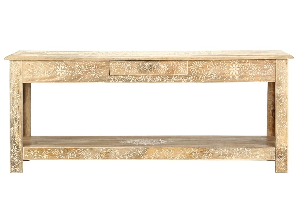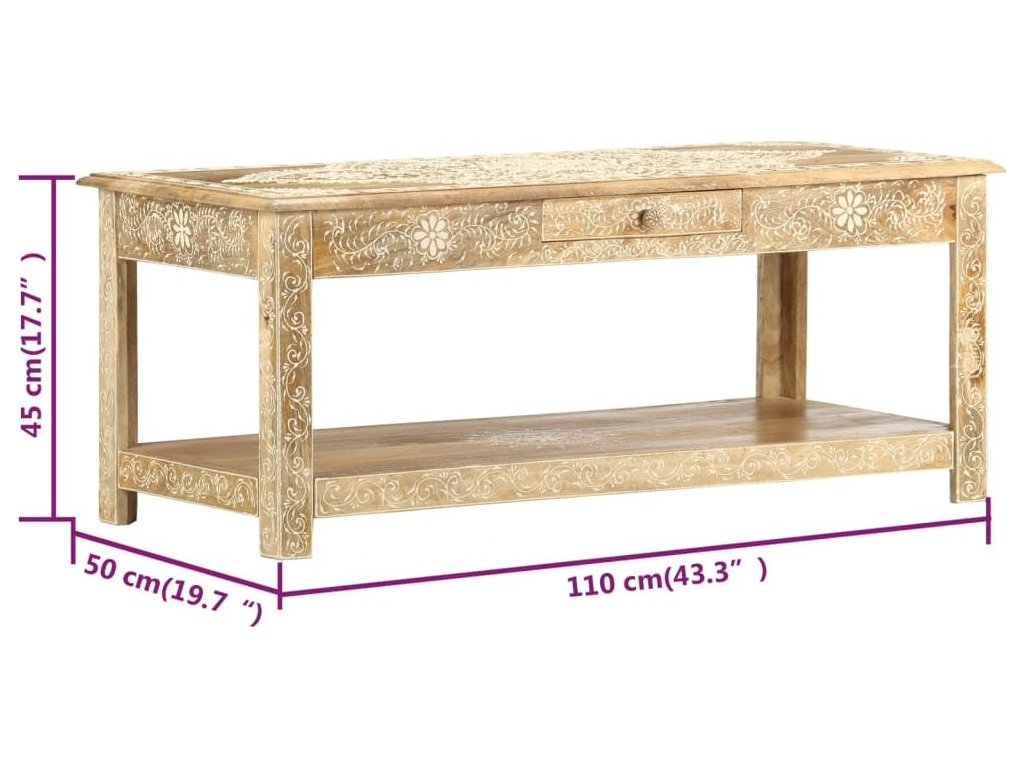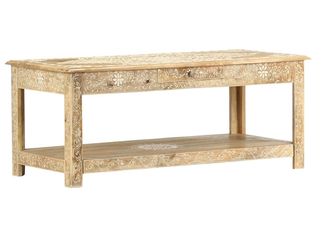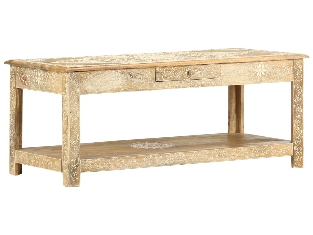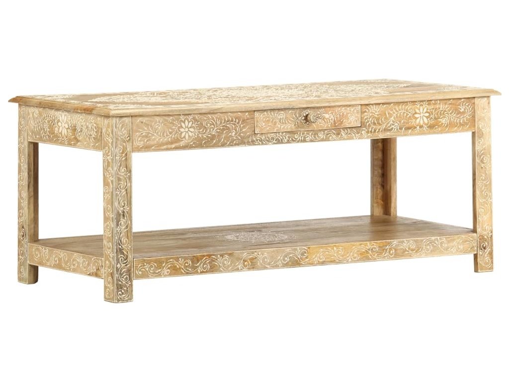 Konferenční stolek je vyrobený z masivního mangovníkového dřeva, které je nejen stabilní a odolné, ale zároveň také krásně vypadá. Navíc ho zdobí ručně malovaný vzor a zručné řemeslné zpracování podtrhuje jeho působivý retro styl. Každá fáze výrobního procesu je prováděná s mimořádnou péčí, ať už se jedná o leštění nebo lakování. Rukodělné provedení a překrásná kresba dřeva dávají každému kusu nábytku zcela jedinečný charakter, jímž se lehce liší od všech ostatních. Velká spodní přihrádka a malá prostřední zásuvka vám poskytnou dodatečný prostor k uložení nejrůznějších věcí. Dřevěný povrch s ozdobnými ornamenty přidává stolu na eleganci. Sestavení konferenčního stolku je jednoduché.