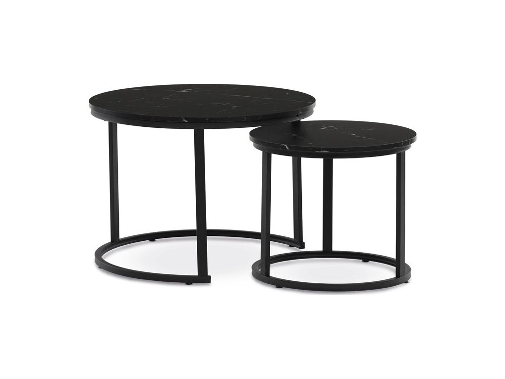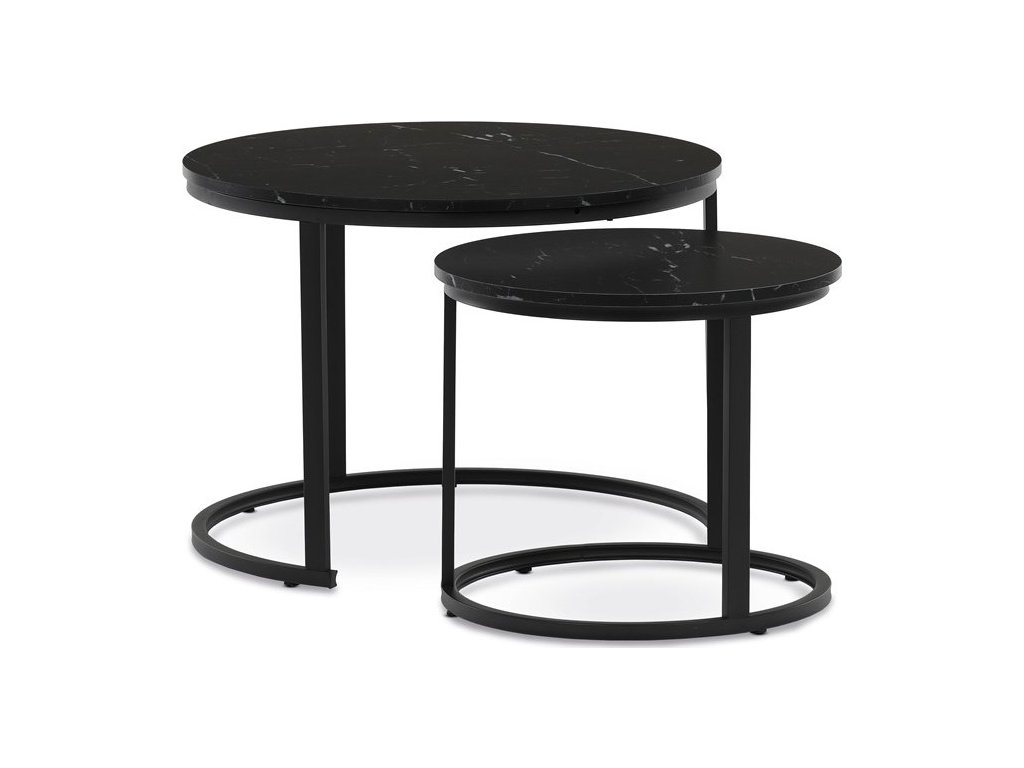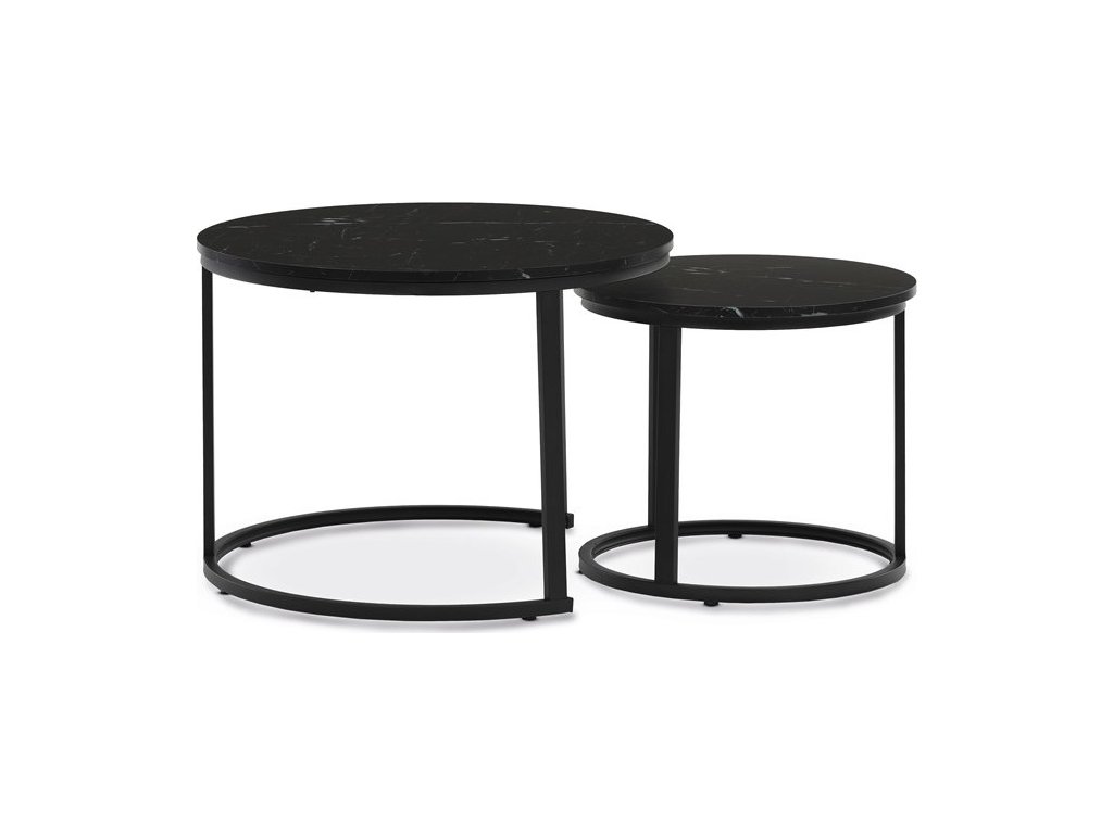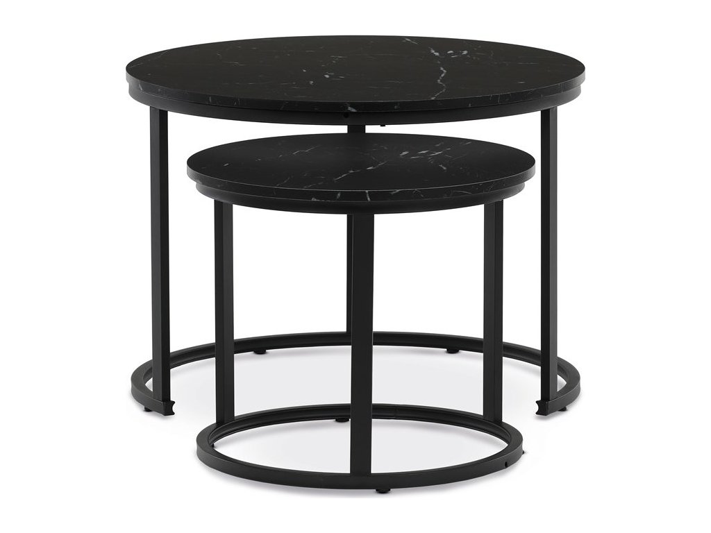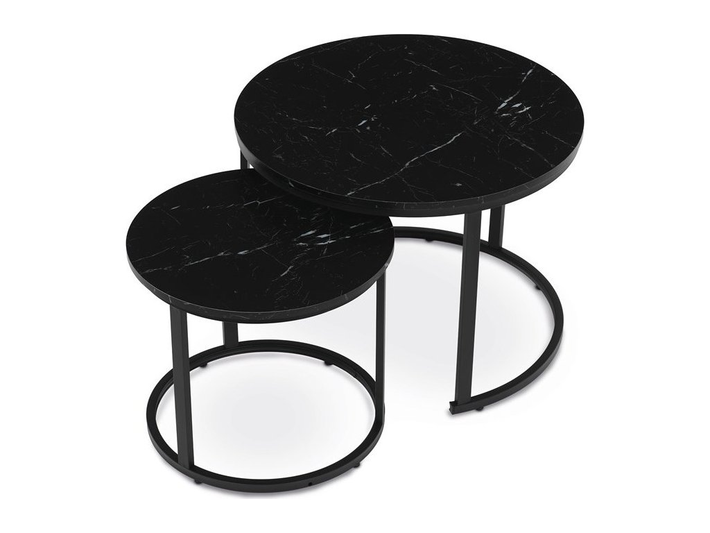 Set dvou konferenčních stolků s deskami z MDF v dekoru černého mramoru a matnou povrchovou úpravou nabízí moderní řešení pro obývací pokoj či kancelář. Kovová podnož v černém laku zajišťuje pevnou a stabilní oporu, zatímco kulatý tvar stolů přispívá k elegantnímu a vzdušnému vzhledu. Větší stolek dosahuje výšky 50 cm, menší je o něco nižší, což umožňuje jejich praktické skládání a variabilní uspořádání prostoru. Kombinace kvalitních materiálů a precizního zpracování zaručuje dlouhou životnost a snadnou údržbu. Tento set je vhodný pro moderní interiéry, kde oceníte funkčnost i design.