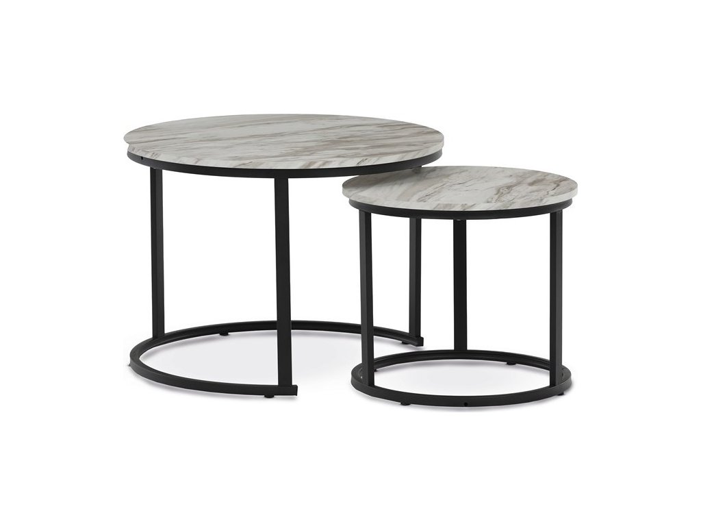 Set dvou konferenčních stolků s deskami z MDF v dekoru bílého mramoru nabízí moderní a praktické řešení pro obývací pokoj. Desky jsou opatřeny matnou povrchovou úpravou, která usnadňuje údržbu a zachovává přirozený vzhled mramorového dekoru. Podnože jsou vyrobeny z pevného kovu s černým lakem, který zajišťuje stabilitu a dlouhou životnost. Menší stolek lze zasunout pod větší, což umožňuje flexibilní využití prostoru. Výška většího stolku je 50 cm, což je ideální rozměr pro pohodlné odkládání nápojů či dekorací.