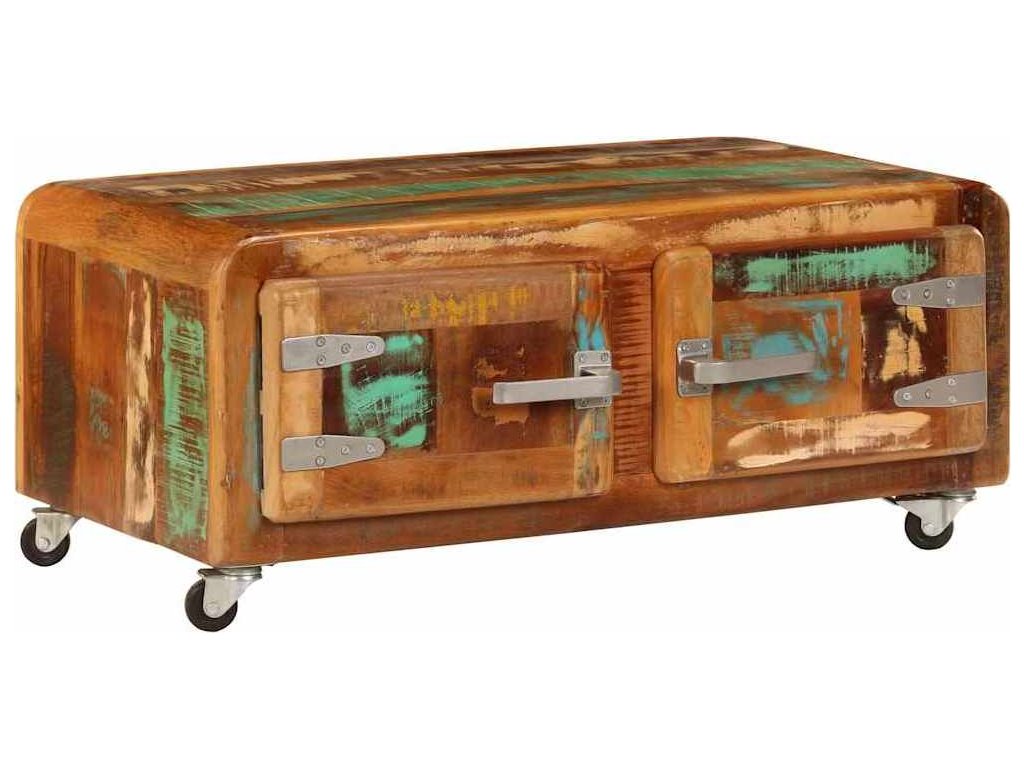 Stolek k pohovce je vyrobený z masivního recyklovaného dřeva, které pochází z trámů, podlah a podpěrných nosníků ze starých budov určených k demolici. Sestává tedy z různých druhů dřeva, jako jsou borovice, teak, buk, dub, cedr, mangovník, akácie apod. Recyklované dřevo tak nabývá vlastností všech těchto rozličných typů dřevin. Navíc je již zestárlé, ošlehané a vyschlé, takže se nesmršťuje ani neohýbá. Odkládací stolek je celý ručně vyrobený a elegantní kresba dřeva ho činí naprosto jedinečným a lehce odlišným od ostatních. Kovové prvky dodávají stolku industriální nádech. Stolek disponuje 2 skříňkami s dvířky, jež vám poskytnou spoustu prostoru k uložení vašich multimediálních zařízení, knížek a dalších věcí. Je rovněž vybavený 4 kolečky, takže se snadno přesouvá.