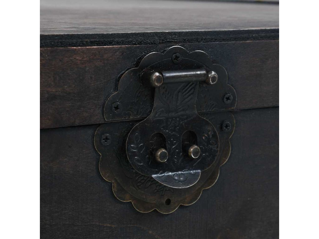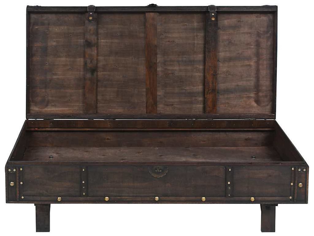 Tento konferenční stolek je vyroben z překližka se starožitně vyhlížejícím zbarvením a je zdoben řemínky z umělé kůže a kovovými cvočky, jež mu dodávají působivý vintage šarm. Dřevěný stolek uvnitř disponuje rozlehlým úložným prostorem, kam můžete ukládat oblečení, knihy, časopisy a všechno ostatní, co chcete mít po ruce, nikoli však na očích. Díky západce a rukojetím, které umocňují jeho vintage vzhled, lze konferenční stolek snadno zavřít a přesouvat. Montáž je snadná.