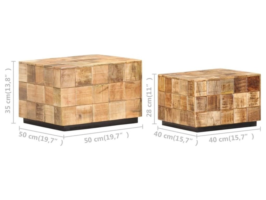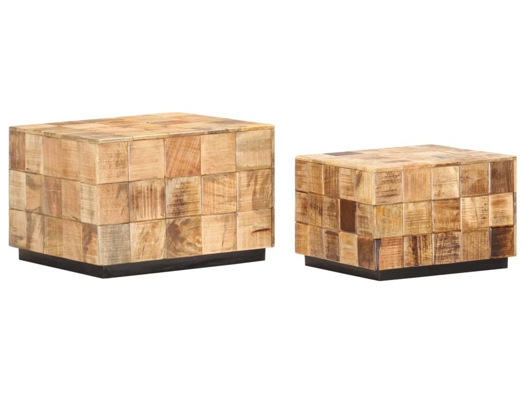 Tento set konferenčních stolků z masivních dřevěných špalíčků z mangovníkového dřeva je stylový a snadno se čistí vlhkým hadříkem. Mangovníkové dřevo je masivní, stabilní, má dlouhou životnost a okouzlující vzhled. Známky opotřebení a viditelná kresba dřeva vypovídají o unikátní historii každého kusu a zdůrazňují jeho přírodní krásu. Každý krok výrobního procesu se provádí s největší péčí, ať už jde o leštění, natírání nebo lakování. Stolky jsou perfektní pro odkládání nápojů, mís s ovocem, dekorací apod.