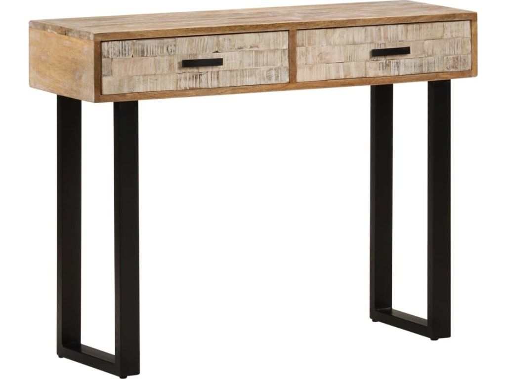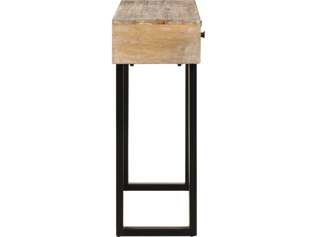 Stolní deska z masivního mangovníkového dřeva poskytuje spoustu místa pro vystavování dekorativních předmětů, zarámovaných fotografií, nebo i pokojových rostlin, zatímco drobné předměty, jako jsou klíče, zápisníky, pera a další drobnosti, můžete ukládat do dvou prostorných zásuvek. Železné krychlové nohy dodávají stolku bytelnost a industriální styl. Viditelná struktura dřeva propůjčuje každému kusu nábytku jedinečný a od ostatních lehce odlišný charakter.
