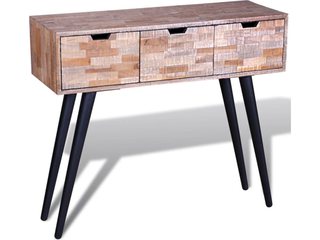 Tento kultivovaný teakový konzolový stolek je nadčasovým doplňkem pro váš domov. Jeho masivní dřevěná deska poskytuje dostatek prostoru pro dekorativní předměty, fotorámečky nebo dokonce hrnkové rostliny, zatímco vy můžete uložit malé předměty, jako jsou klíče, poznámkové bloky, pera a jiné drobnosti do jeho třech prostorných zásuvek. Může být také použit jako konzole skříně, příborník, skříňka, stolek atd