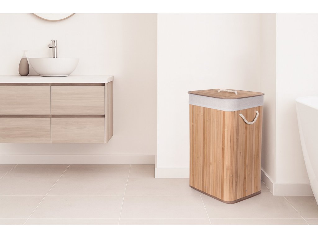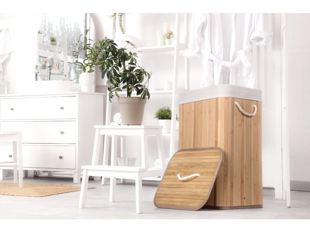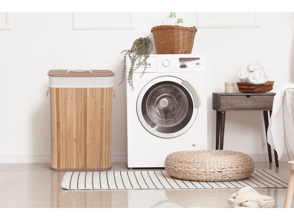 Jak vybrat nejlepší koš na špinavé prádlo? Co se materiálu koše týče, doporučujeme jednoznačně bambus. Je odolný vůči vlhkosti, takže jej můžete bez obav umístit do koupelny nebo servisní místnosti s pračkou. Zároveň je i vizuálně velmi příjemný – kombinace přírodního materiálu a bílé vložky a madel evokuje pocit čistoty, navíc se i hodí k jakémukoliv interiéru.