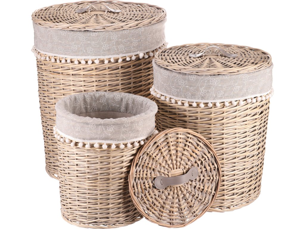 Sada tří kulatých proutěných prádelních košů s víkem v přírodní barvě, které jsou vyloženy šedou látkou s okrasnými kulatými třásněmi. Elegantní a praktický doplněk do vaší domácnosti, který dodá prostoru útulnost a uspořádanost, přičemž vám pomůže s úschovou špinavého prádla.